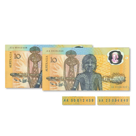 1988 $10 Bicentennial Overprint AA00 First Prefix & AA23 Last Prefix Banknote Pair Uncirculated