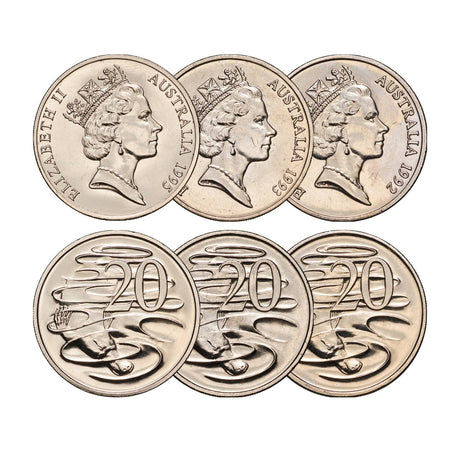 Australia 1992, 1993, & 1995 20c Brilliant Uncirculated 3-Coin Set