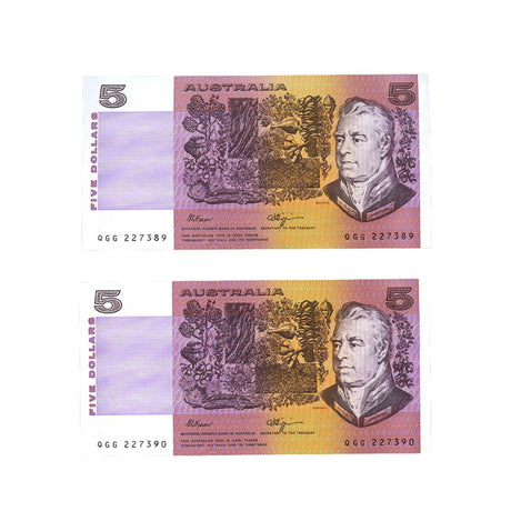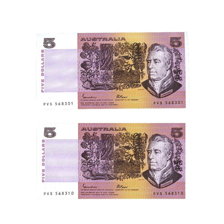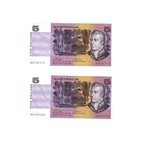 1990 R212 $5 Fraser/Higgins Banknote Consecutive Pair Uncirculated