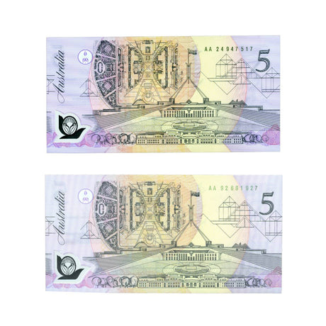 Australia 2001 $5 Federation AA01 First Prefix & JD01 Last Prefix Uncirculated Banknote Pair