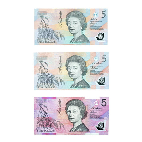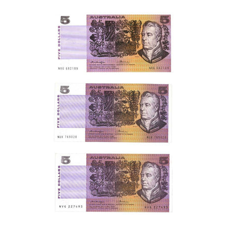 Australia 1985-91 Last Three Paper $5 Uncirculated Banknote Set