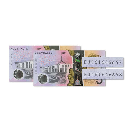 2016 $5 R224L Stevens/Fraser EJ16 Last Prefix Banknote Consecutive Pair Uncirculated