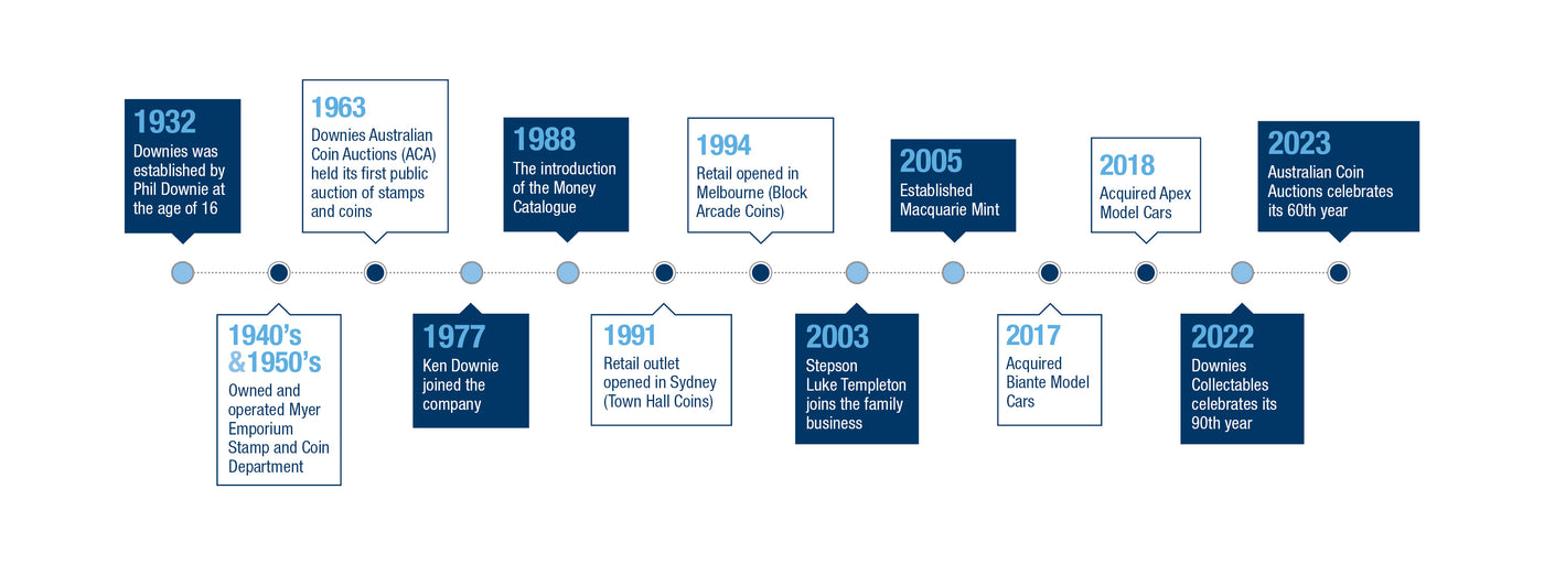 1963 marked the birth of Downies' auction business, Australia’s longest running numismatic auction house! A groundbreaking venture that transformed the company into Australia’s go-to numismatics hub. Today, Downies Australian Coin Auctions (ACA) is a celebrated name, known for its exciting quality auctions that attract enthusiasts both in-person and online. In 2005, Downies was appointed by the Reserve Bank of Australia to auction its entire collection of rare gold coins, in the most famous sale of its kind in Australian numismatic history.