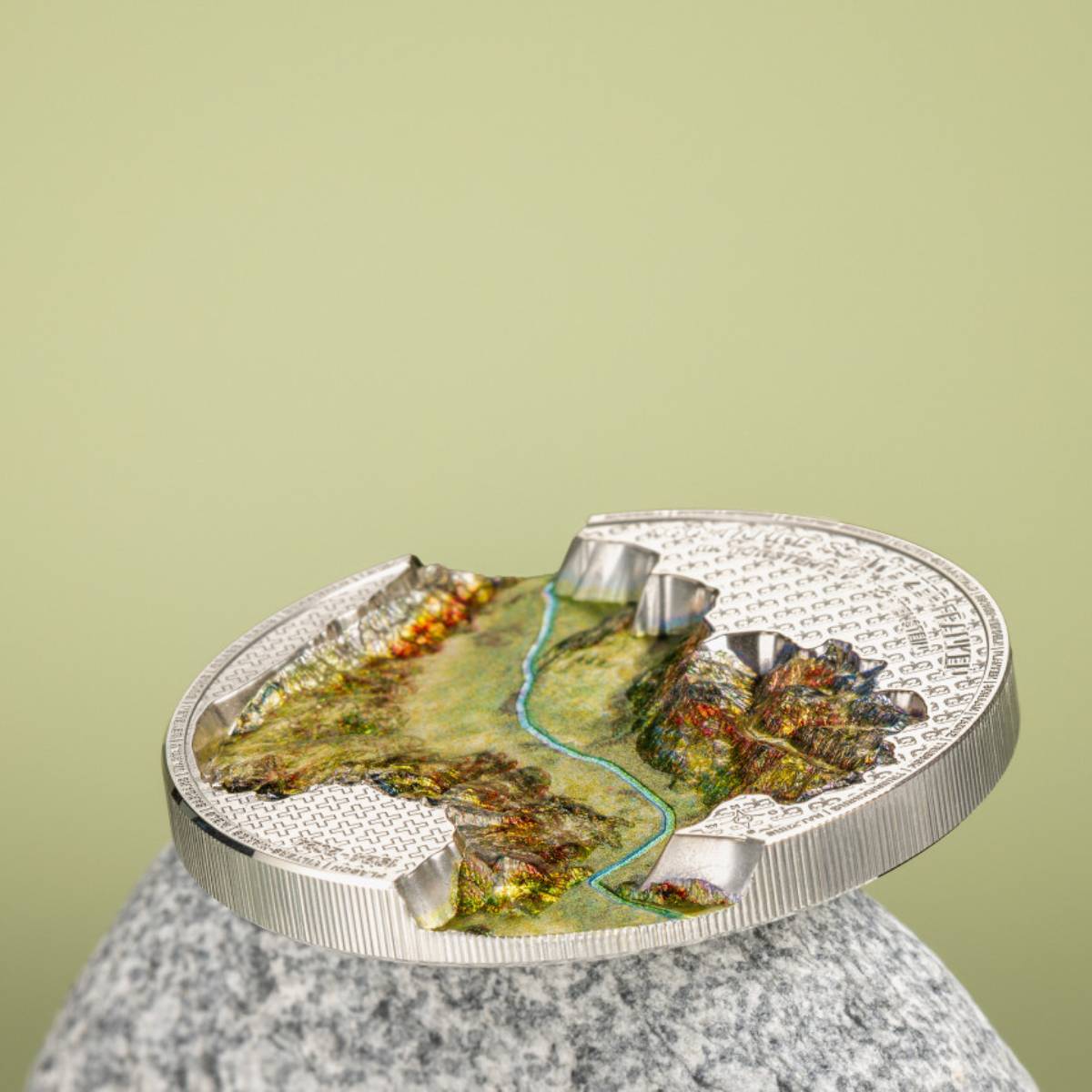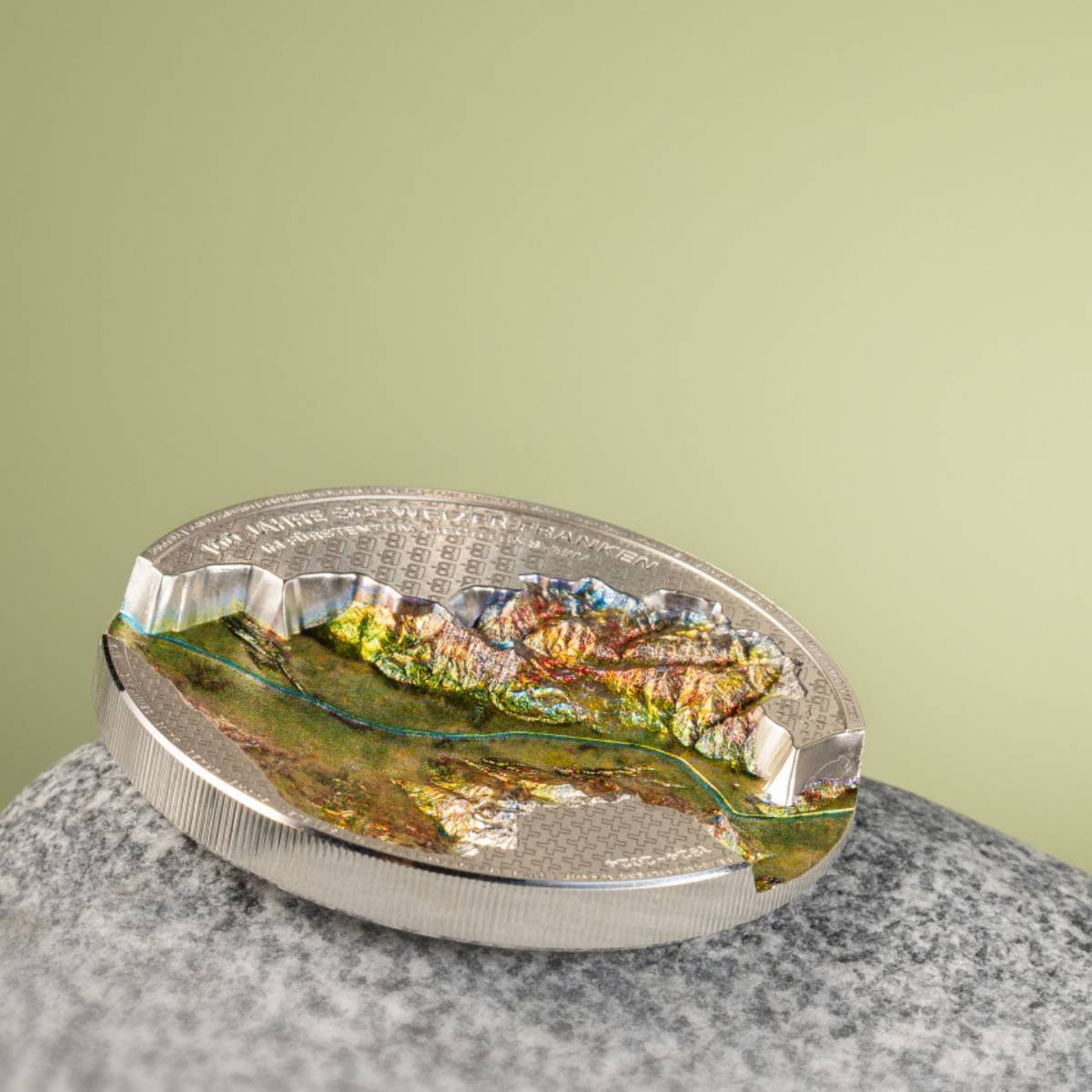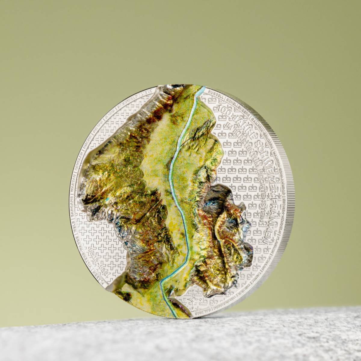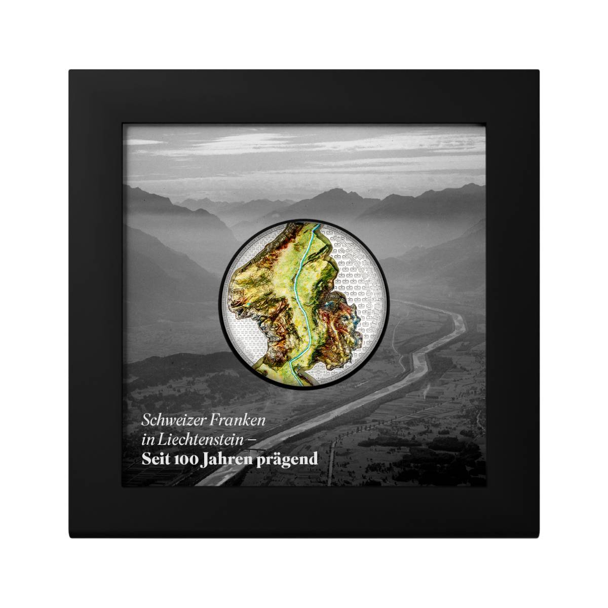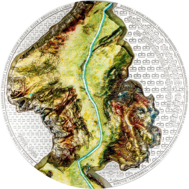 Crafted with smartminting Ultra Deep Relief, the coin features a topographically accurate depiction of the Rhine Valley, symbolizing the enduring bond between Liechtenstein and Switzerland.
