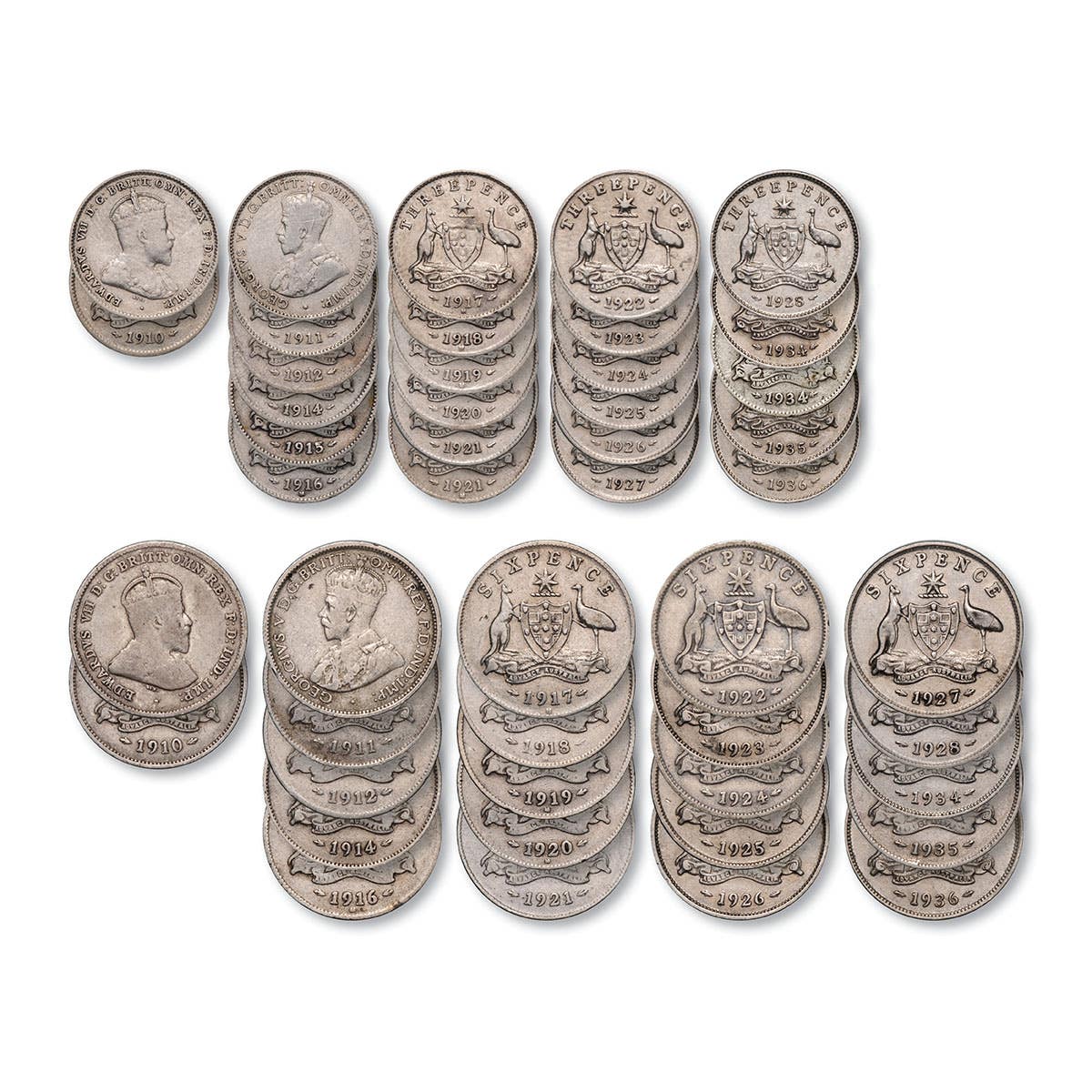 Features an example of nearly every Australian Edward VII and George V threepence and sixpence.