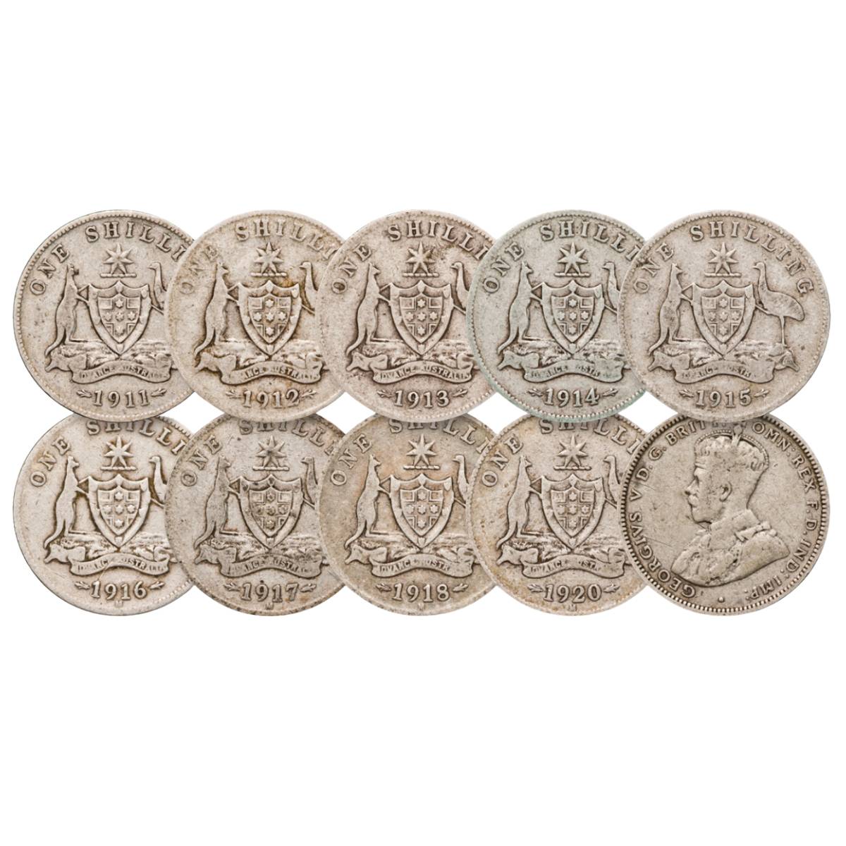 George V 1911-20 Shilling 9-Coin Set Good-Very Good