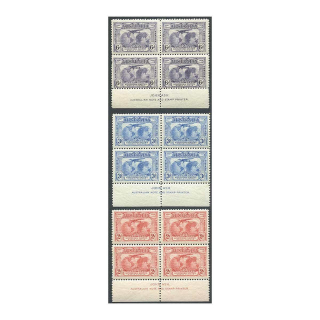 Australia 1931 2d, 3d, 6d Kingsford Smith Stamps Ash Imprint Blocks of Four Set of 3 Mint Unhinged