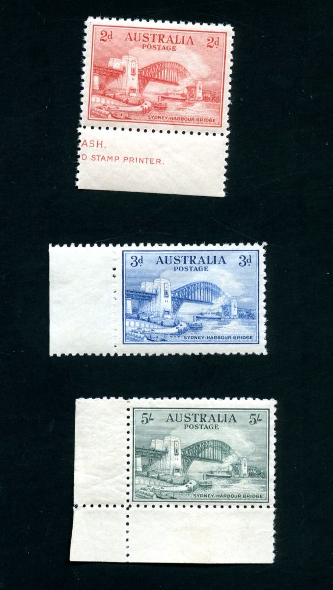 Australia 1932 5/- Green Sydney Harbour Bridge Stamp Ash Imprint Strip of Three Mint Unhinged