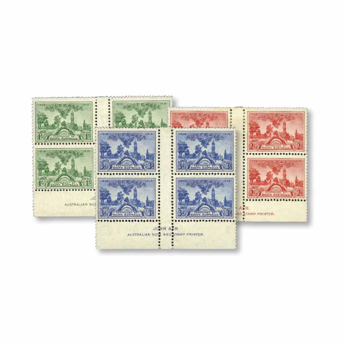 1936 2d, 3d & 1/- South Australia Centenary Imprint Block of Four Set MLH/MUH