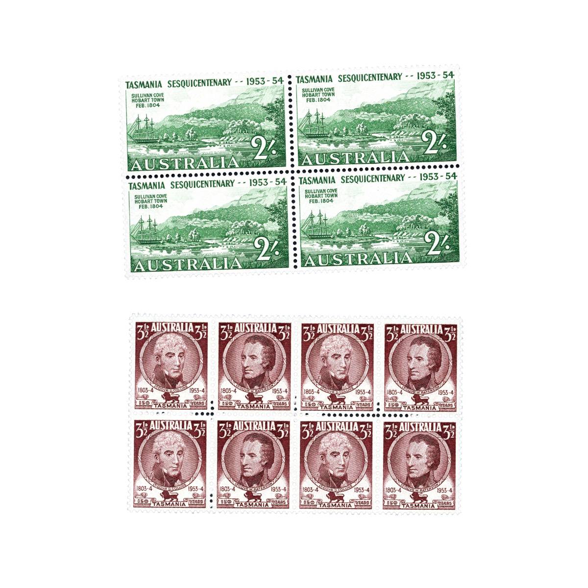 1953 Tasmania Sesquicentenary Block of Four & Block of Eight Pair Mint Unhinged