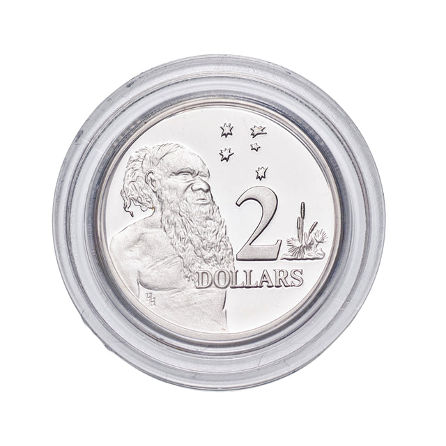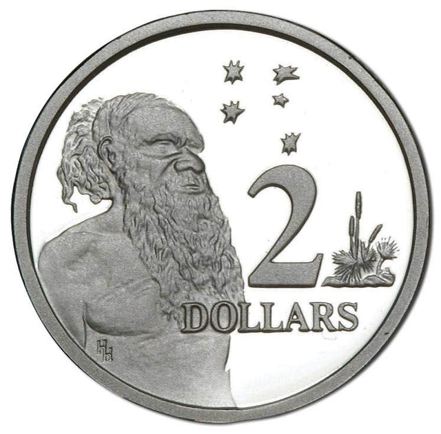 Created by Royal Australian Mint designer Horst Hahne, the first $2 was Australia’s third currency issue to recognise Australia’s indigenous heritage. Depicting an aboriginal elder beneath the Southern Cross, this groundbreaking type was struck by the Royal Australian Mint in 1988 – the year that marked the 200th anniversary of European settlement of Australia.