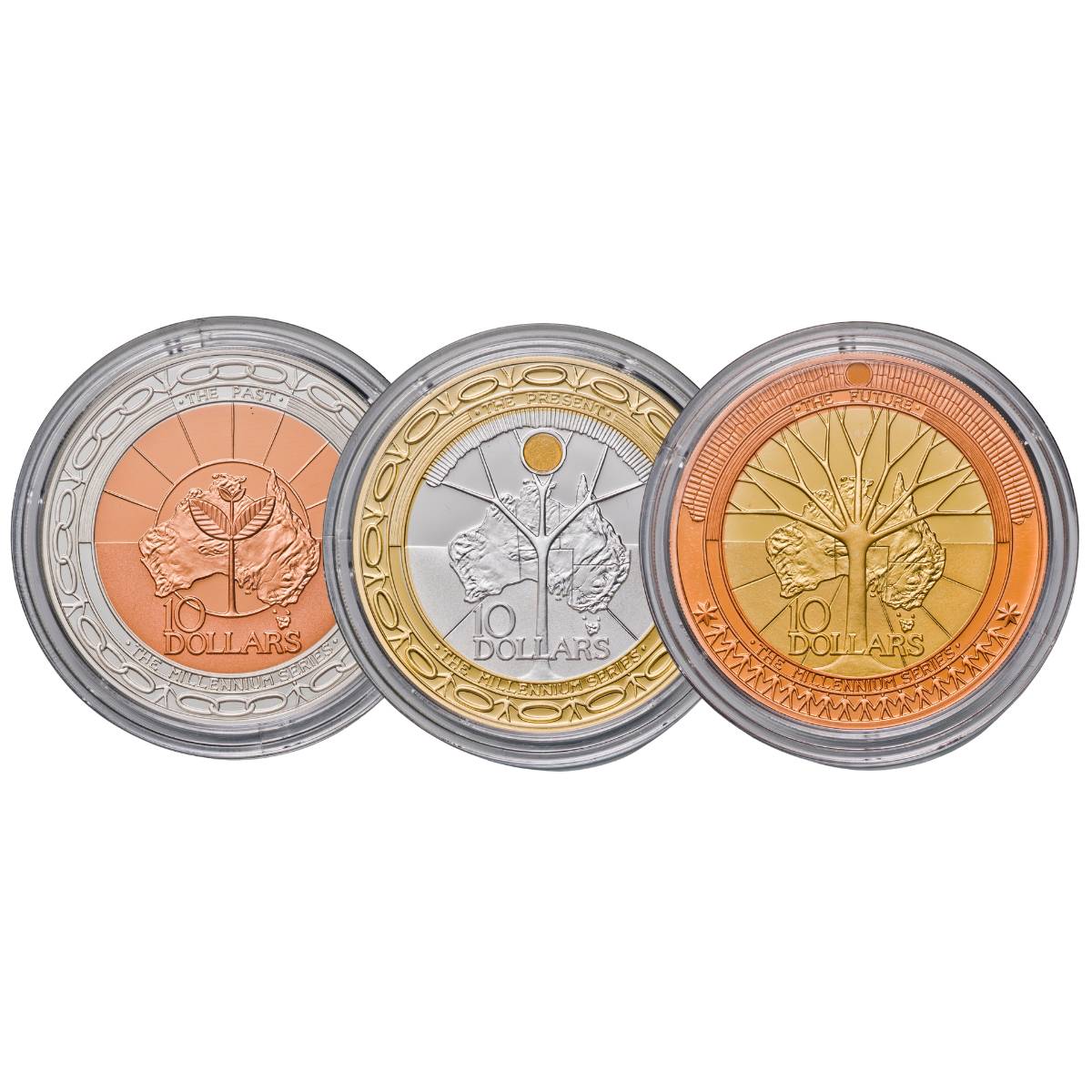 First ever $10 Bi-Meta coin issues Collection of three $10 silver coins issued at time of new Millenium highlighting the Past, Present and Future.