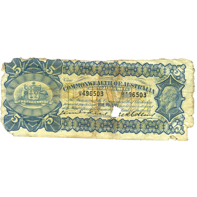Australia George V 1924 £5 R38bL Kell/Collins Last Prefix Good-about Very Good Banknote