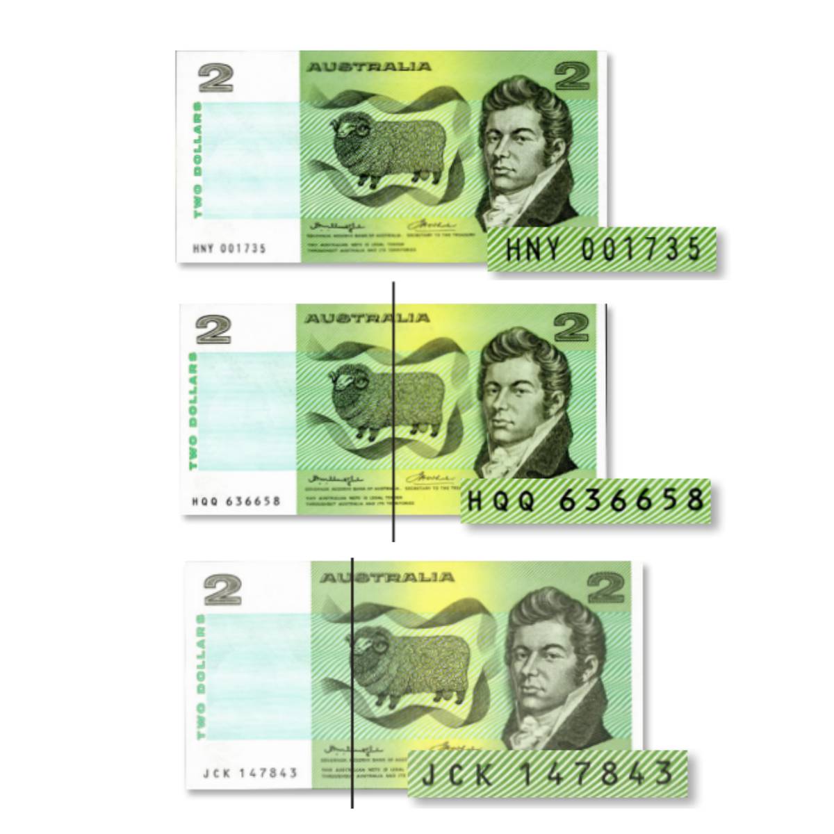 Australia 1976 $2 R86a, R86b & R86c Knight/Wheeler Gothic, OCR-B Centre Thread & OCR-B Side Thread Uncirculated Banknote Trio