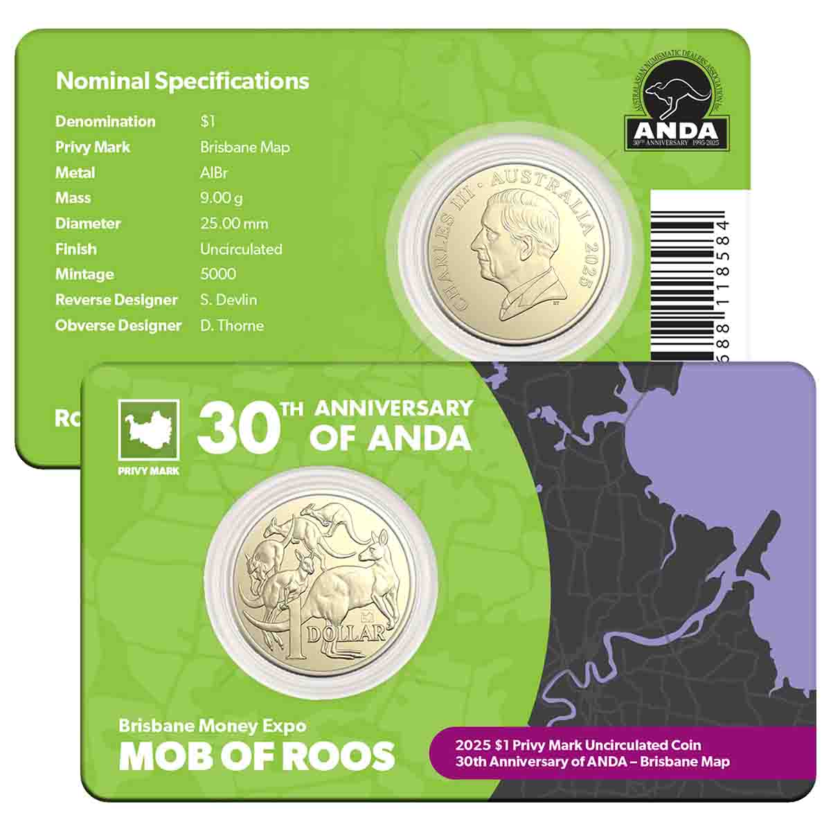 An inspired and entirely fitting celebration of the Brisbane Money Expo, the Map of Brisbane privymark adorns the classic Mob of Roos design by Stuart Devlin. Struck to Uncirculated standard by the Royal Australian Mint, the obverse carries the year of issue, 2025, and the portrait of Charles III. A fine presentation, each coin is set in an ANDA 30th anniversary pack!