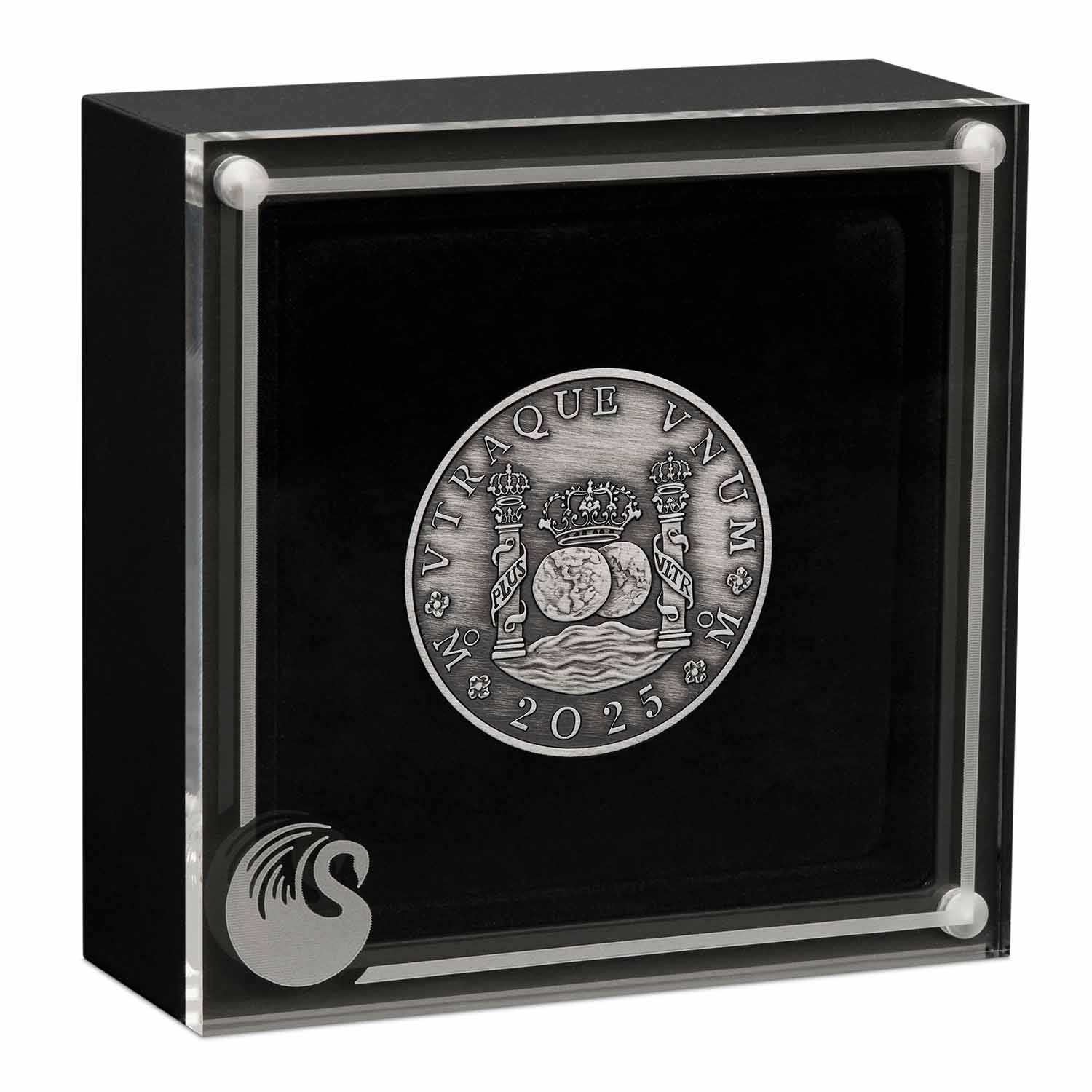 The perfect way to celebrate the 225th anniversary of our first currency system, this 99.99% silver coin is a stunning recreation of Spain’s legendary Silver ‘Pillar’ Dollar. Famous as the origin for the $ sign, inspired by the S-shaped configuration of the banners around the Pillars of Hercules, the Spanish Silver Dollar was among the world’s most trusted, most widely accepted trade coins. Also known as a ‘Piece of 8’, the Spanish Silver Dollar circulated extensively in the colony, and was listed in Governor King’s Proclamation of 1800 at a value of five shillings.