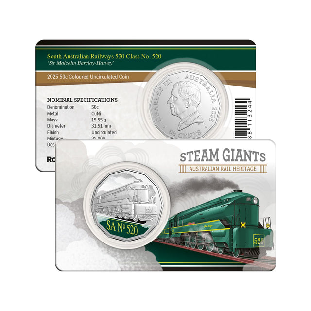 Australia Steam Giants 2025 50c South Australian Railways 520 Class No. 520 ‘Sir Malcolm Barclay-Harvey’ Colour Cupro-Nickel Uncirculated Coin