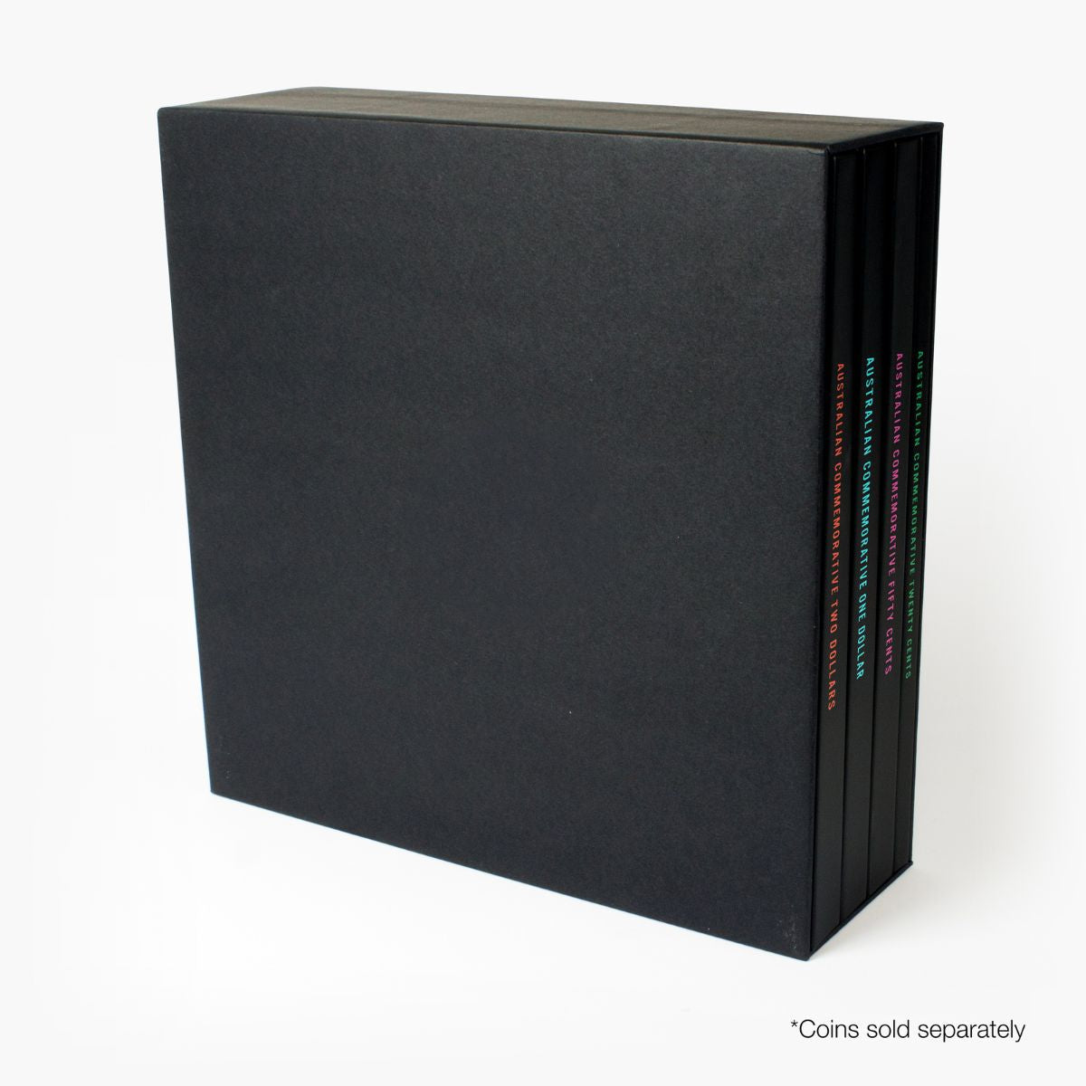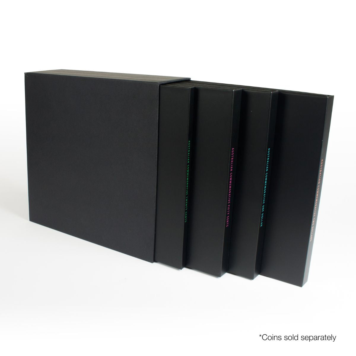 Sturdy, handy and affordable, and beautifully presented within a protective slipcase, the four folders cover Australia’s four key commemorative denominations – 20c, 50c, $1 & $2. Each folder can accommodate the First Year of Issue date of its denomination, as well as virtually every commemorative type issued for circulation right up to the current day! Giving you room to expand, each folder also includes spaces for future issues! An impressive, informative collector accessory, each folder also features the final mintage figure of the First Year of Issue date and virtually all circulating commemorative types of its denomination.