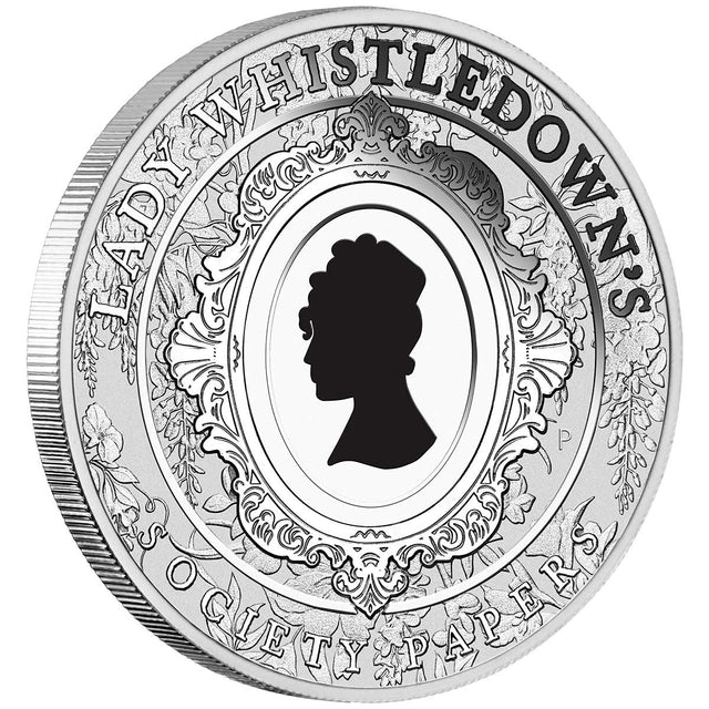 A superb work of numismatic art, harking back to the glory days of Regency Britain, the broad 40.90mm flan of this 99.99% silver issue carries a silhouetted cameo portrait of Lady Whistledown, surrounded by an ornate Regency-style border. An official legal tender issue of Tuvalu, Jody Clark’s official portrait of King Charles III adorns the obverse.