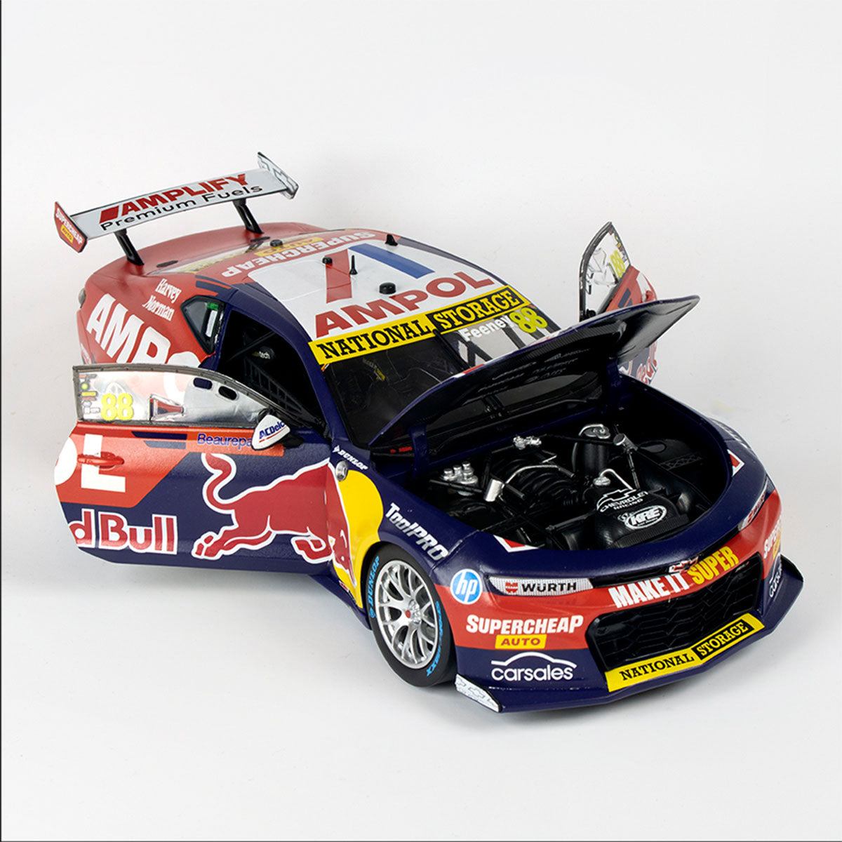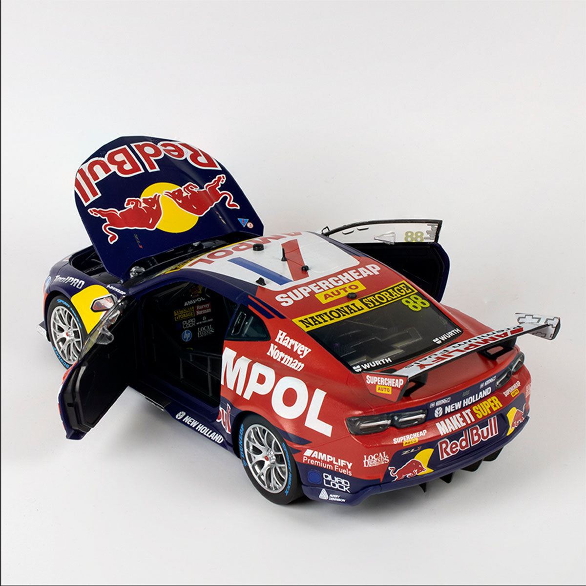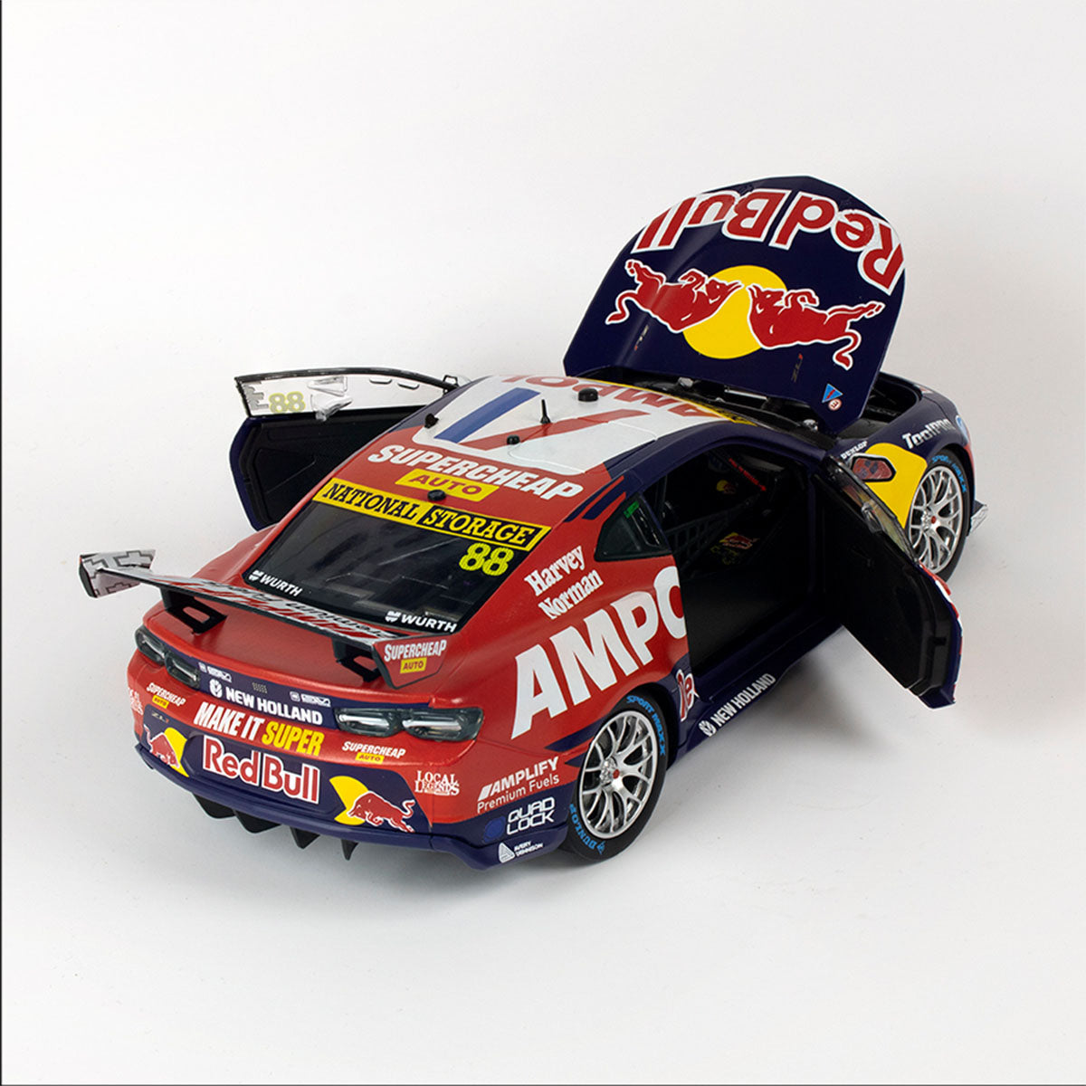 With opening parts in a diecast body, this 1:18 replica model summons memories of an action-packed race, ending in a thrilling VICTORY for Red Bull Ampol Racing! Presented in premium packaging with an individually numbered Certificate of Authenticity, this Supercar replica is a must-have for proud fans and collectors who want to update their displays with the very best of the new Gen3 supercars!