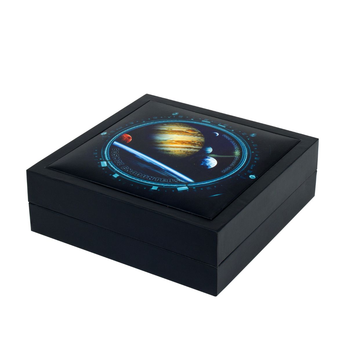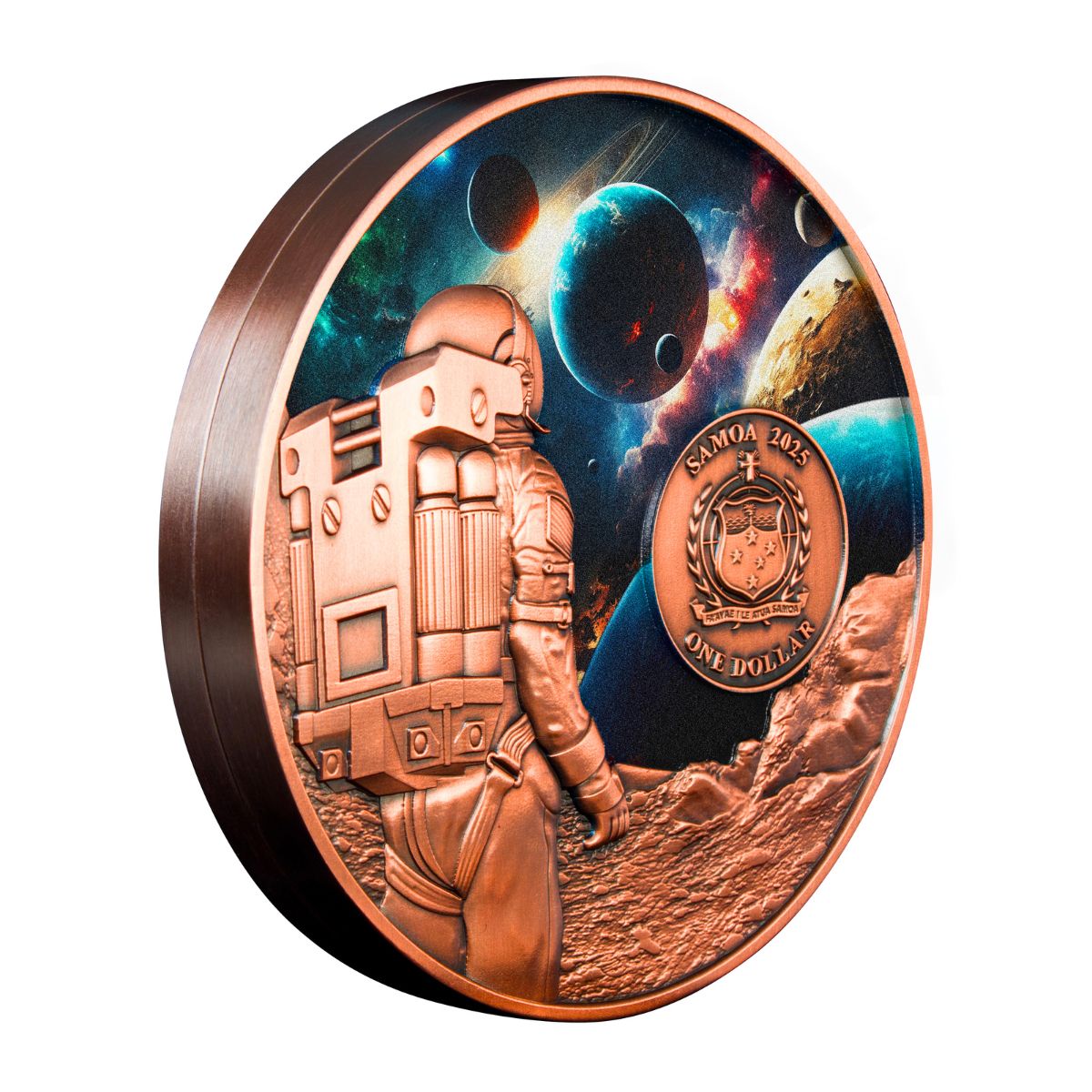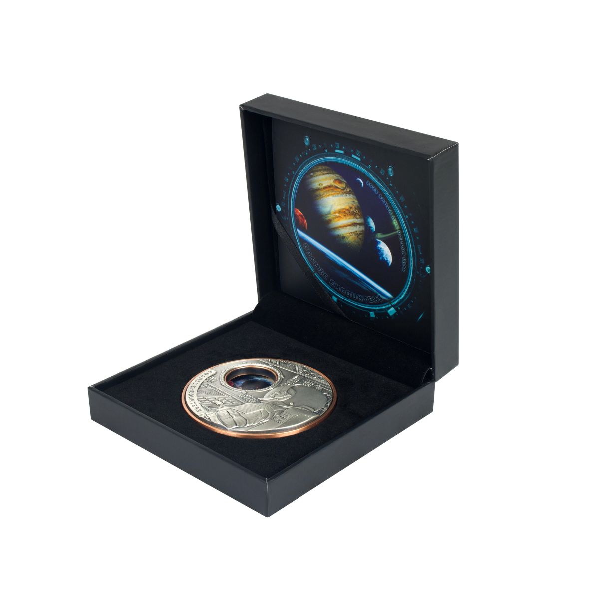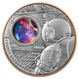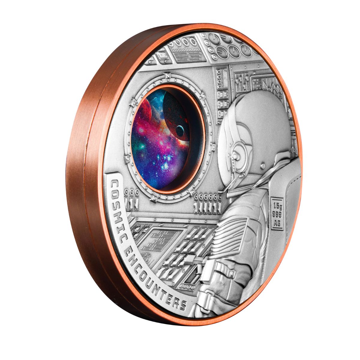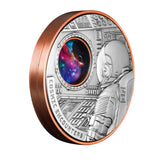 Uniting 15 grams of 99.9% pure silver with a weighty 340 grams of copper, and spanning an enormous 75mm in diameter, this massive modern masterpiece breaks new ground. Rotate the copper base, and watch the Cosmos passing by the window of your spaceship! Underpinned by a razor-sharp High Relief strike, both the reverse and obverse of this stellar release feature a dazzling burst of full-colour.