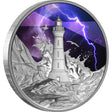 This limited-edition legal tender coin, struck by the Perth Mint, captures the exhilarating spectacle of lightning as it dances across the stormy sky, illuminating the tumultuous ocean below. The sizzling energy of sky is tangible in luminous blues and purples, achieved through magnificent Digital Colour minting on a large 40.90mm flan – struck from 1oz PURE 99.99% SILVER. The brilliant flashes reflect off the ocean's crashing waves, revealing a spectacularly struck lighthouse on a rocky coast line that stands resolute against the tempest. The stark contrast between the bright silver and moody colours of the storm is electrifying!