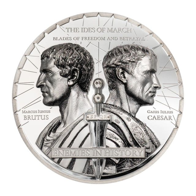 History’s most infamous betrayal comes alive in the Caesar vs. Brutus – Blades of Freedom & Betrayal 2025 2oz Silver Proof Coin. The first release in CIT's new series dedicated to legendary rivalries, this dramatic design recalls the fateful Ides of March, 44 BC — when loyalty to ideals clashed with loyalty to a man, and Julius Caesar fell at the hands of Brutus and his fellow conspirators.