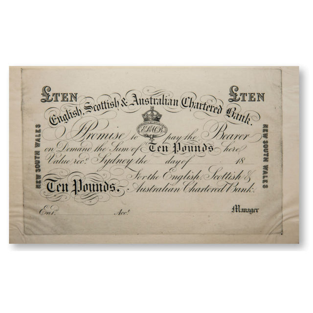The ES&A Chartered Bank £10 proof banknote, dated 18 is an exceptional piece of Australian banking and financial history. Issued by the English, Scottish & Australian Chartered Bank, this note represents the prestige and stability of one of the most influential banks of the 19th century. Proof notes were produced in very limited numbers, often for archival or approval purposes, making them far rarer than circulated issues.
