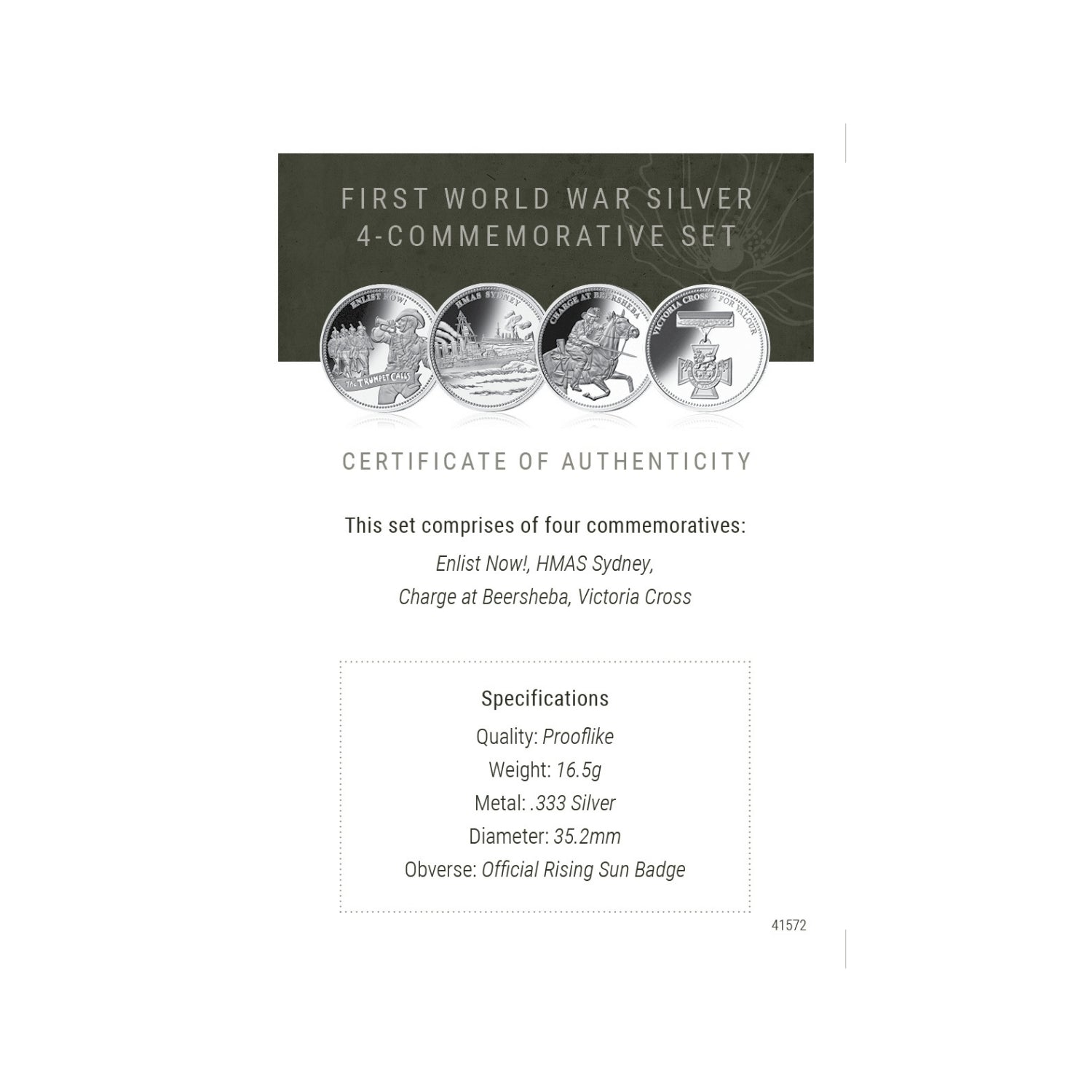 A lasting record of this seminal moment in our history, the First World War Silver 4-Commemorative Set pays tribute to some of the most iconic elements of Australia’s World War I campaign. Superbly designed and sharply struck, the four commemoratives found in this poignant presentation honour HMAS Sydney, the Charge at Beersheba, Enlist Now and the Victoria Cross respectively. Crafted from genuine silver, each Prooflike quality commemorative also features Australia’s iconic Rising Sun Badge on the obverse.