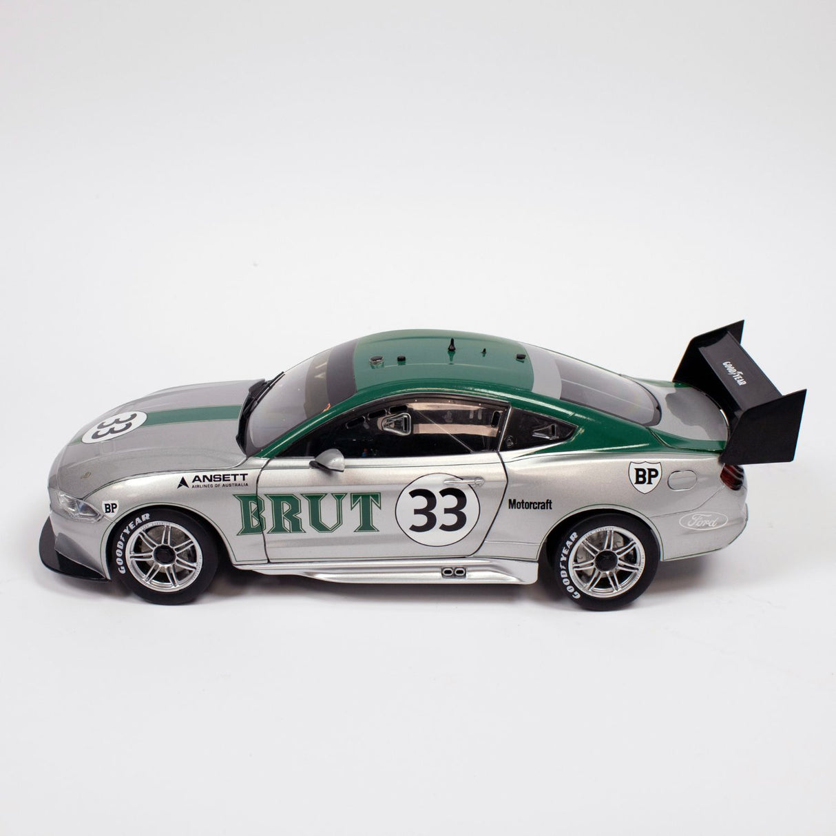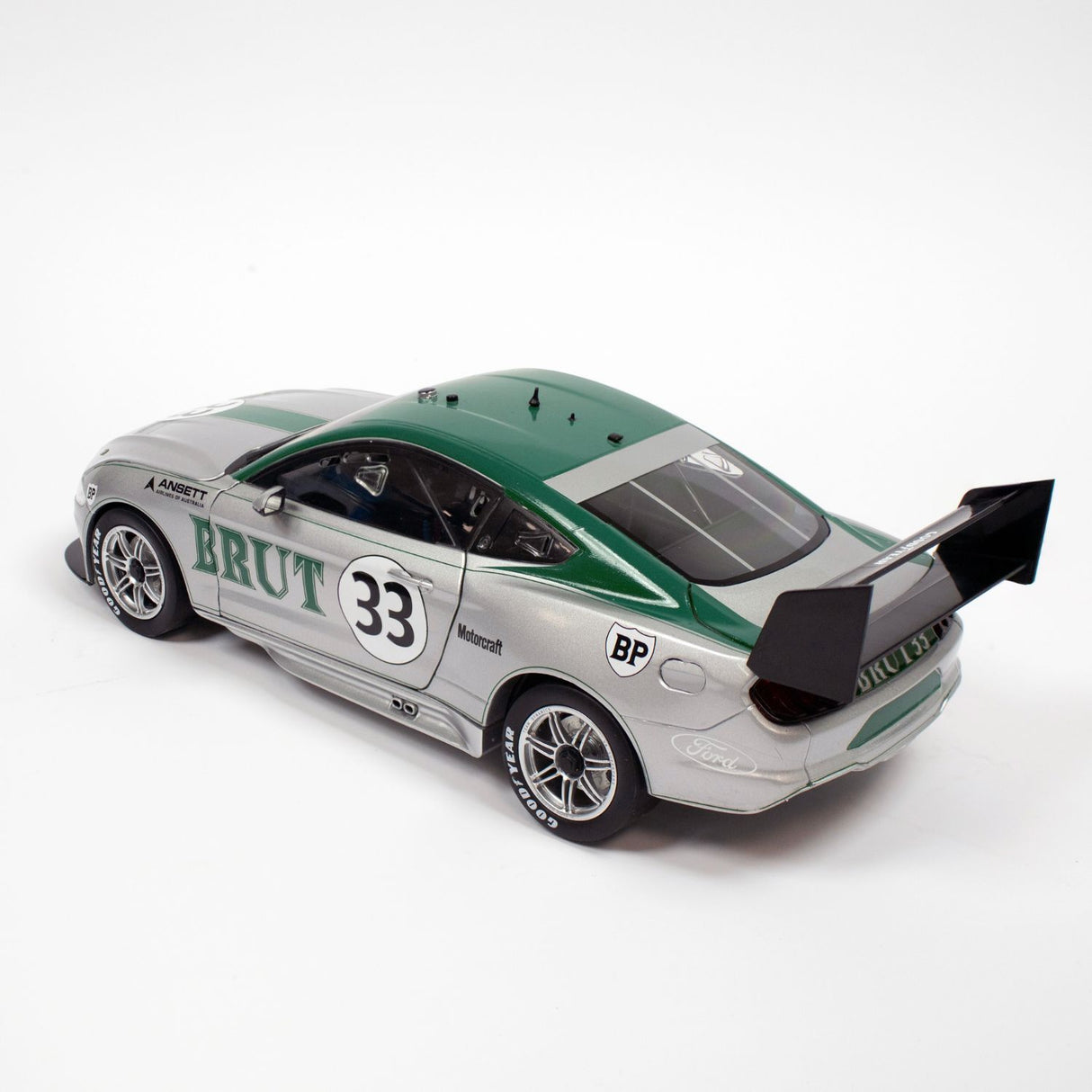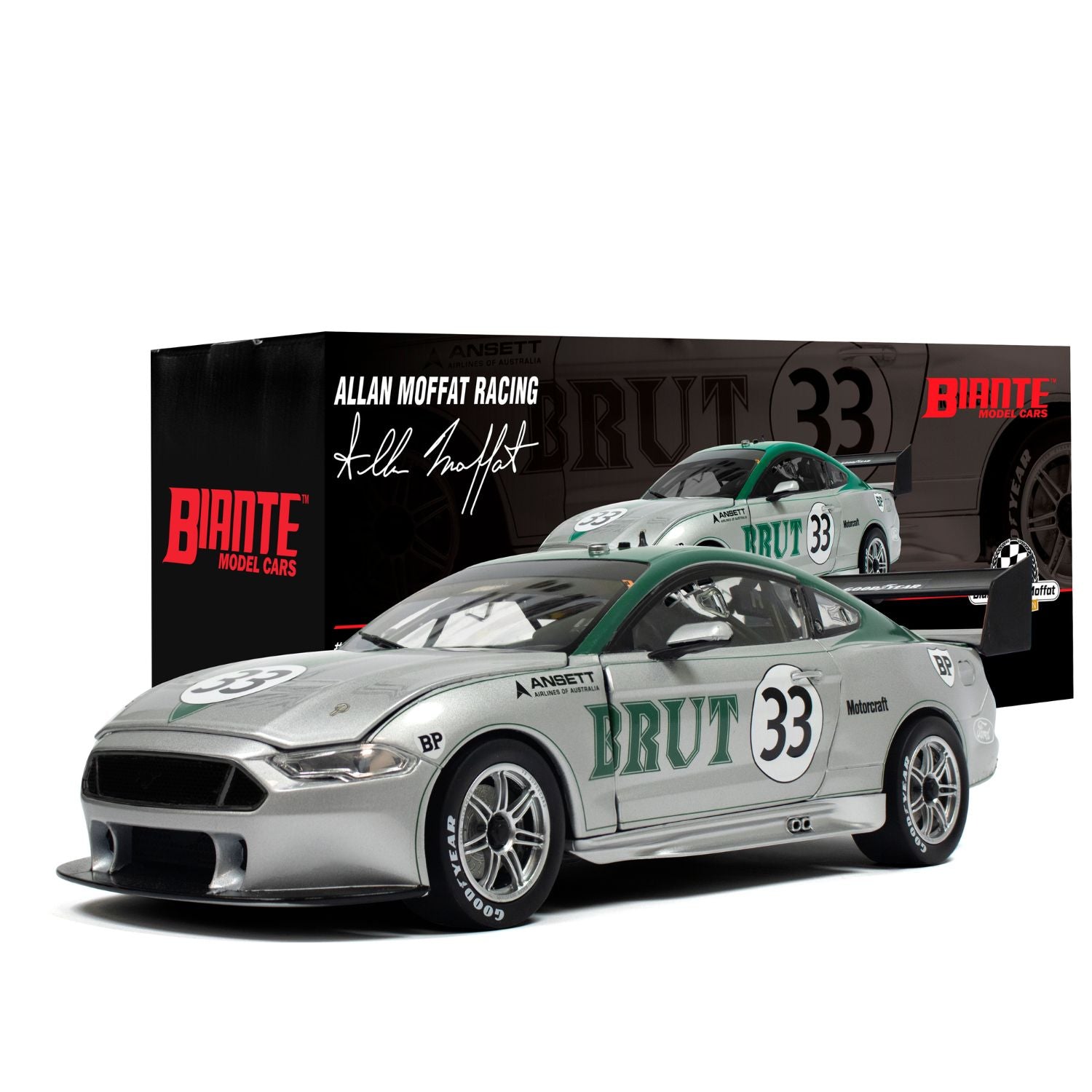 Celebrate a legendary chapter in Australian motorsport history with this highly detailed 1:18 scale diecast model honouring Allan Moffat’s iconic Boss 302 Trans-Am Ford Mustang. A tribute to one of the most famous race cars in Australian motorsport, this model showcases the stunning Brut 33 silver and green livery as raced by Moffat in 1973.