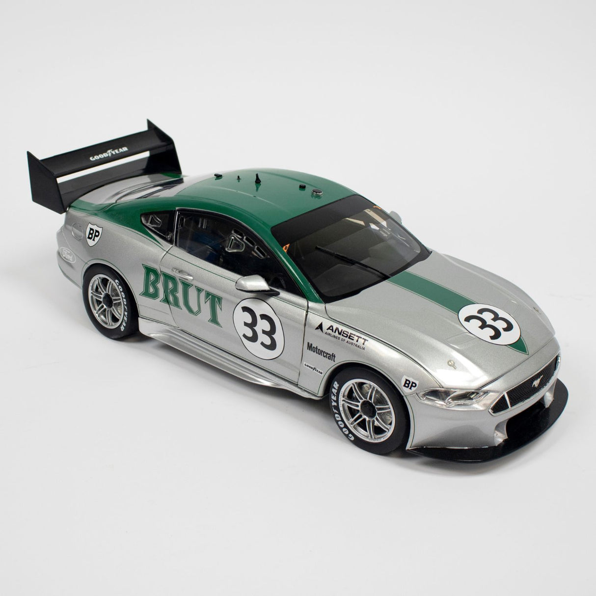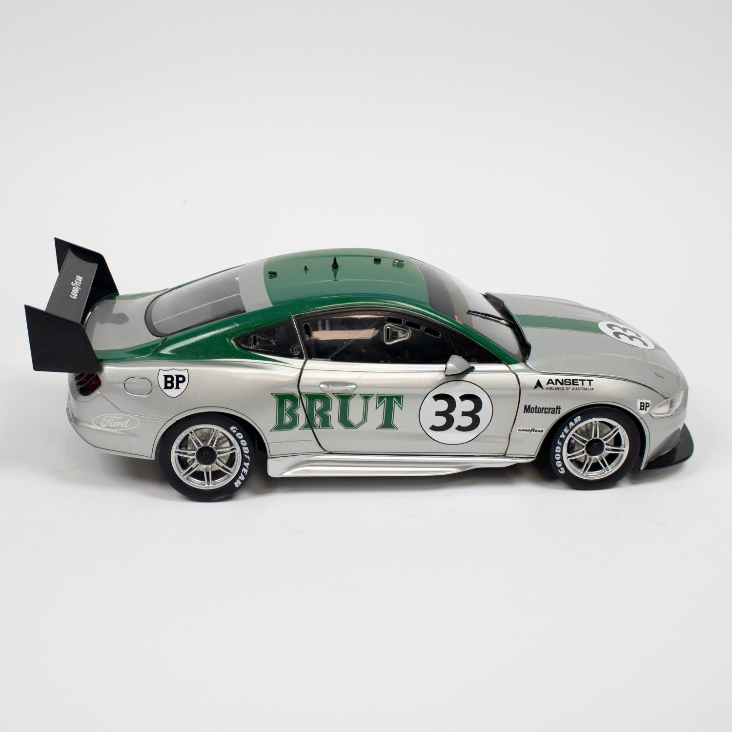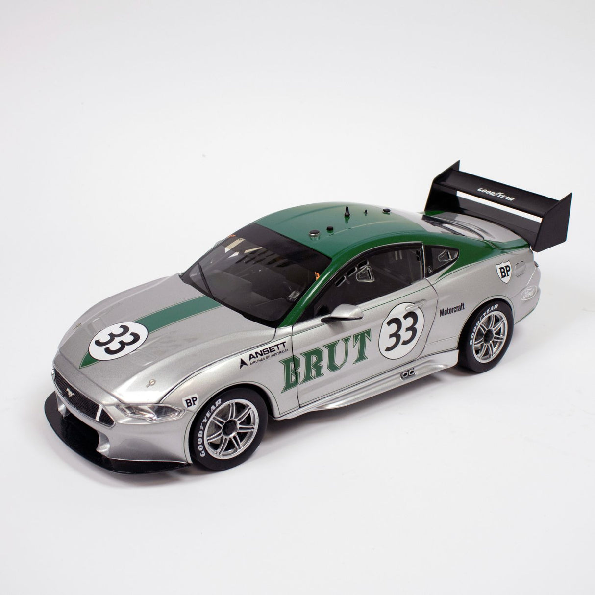 Celebrate a legendary chapter in Australian motorsport history with this highly detailed 1:18 scale diecast model honouring Allan Moffat’s iconic Boss 302 Trans-Am Ford Mustang. A tribute to one of the most famous race cars in Australian motorsport, this model showcases the stunning Brut 33 silver and green livery as raced by Moffat in 1973.