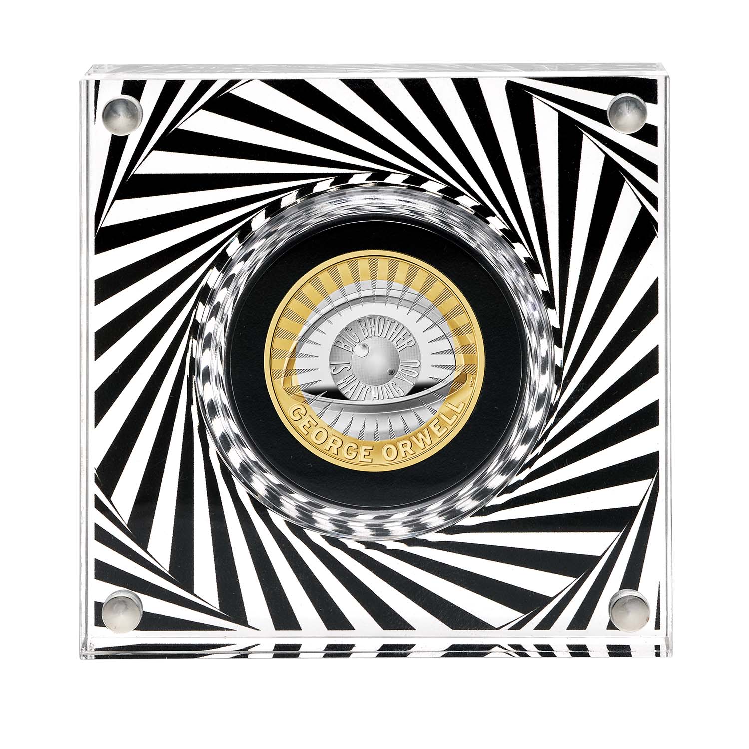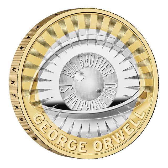This coin features a masterfully crafted reverse design by the artist Henry Gray. In a clever twist, what appears to be an eye at the design’s centrepiece is a camera lens, which acknowledges the theme of totalitarianism in Orwell’s writing. Taken from 1984, the quote ‘Big brother is watching you’ encircles the lens, whilst ‘THERE WAS TRUTH AND THERE WAS UNTRUTH’, another quote from the novel, serves as the coin’s edge inscription.