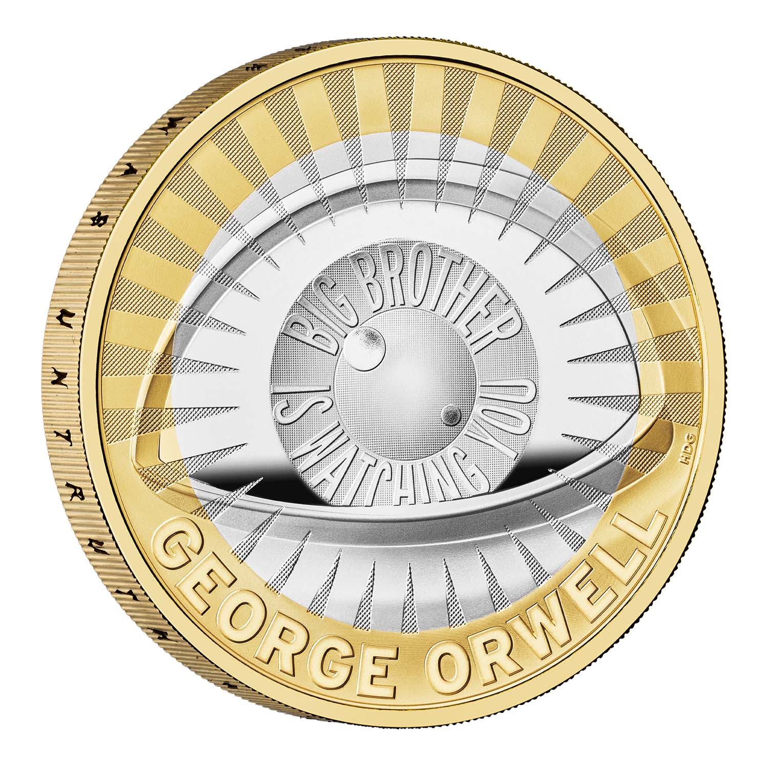 Experienced coinage artist Henry Gray has created a reverse design that incorporates key themes of Orwell’s writings.