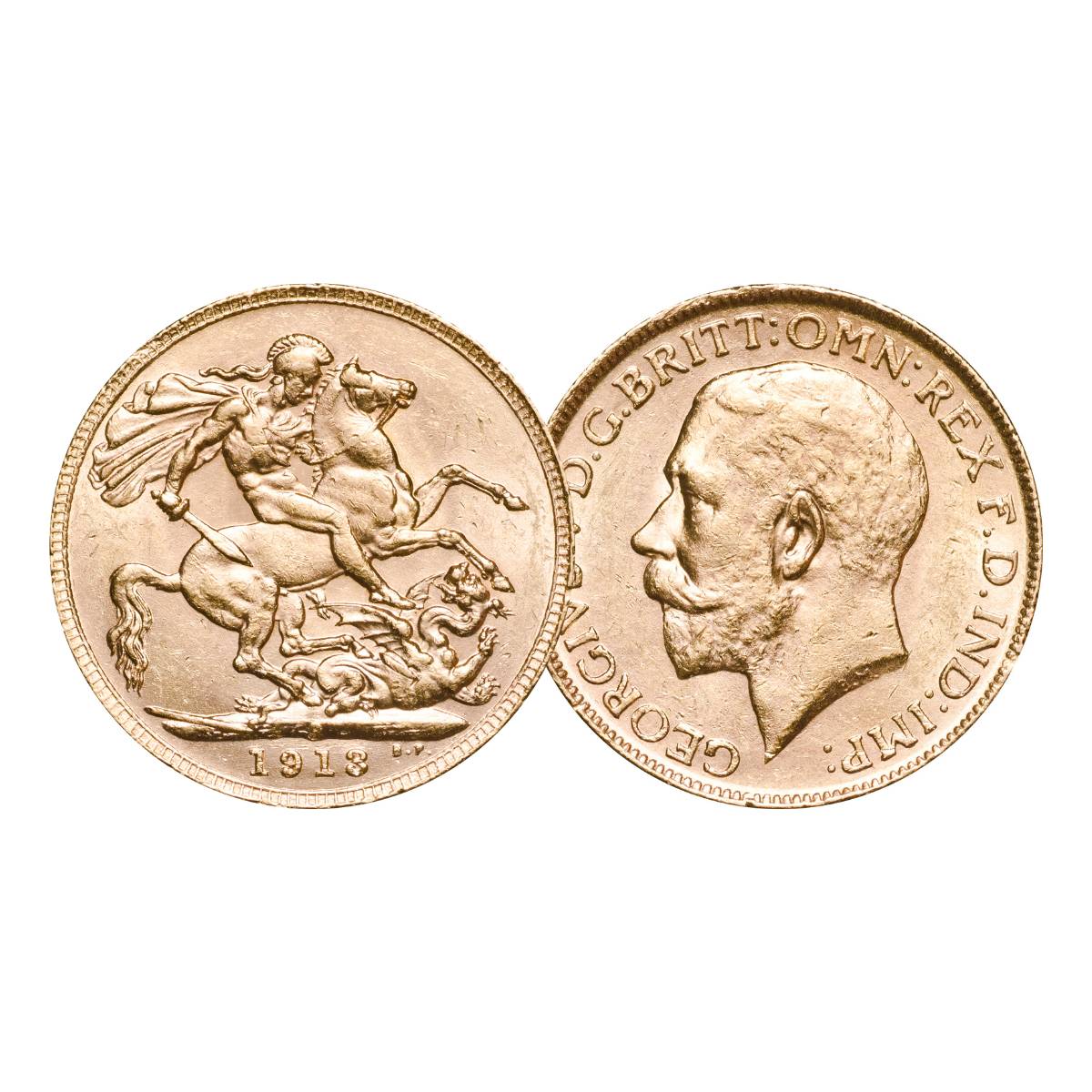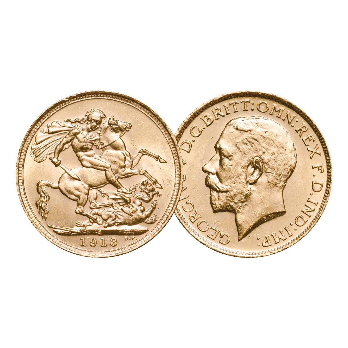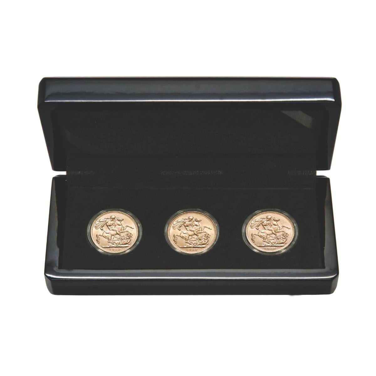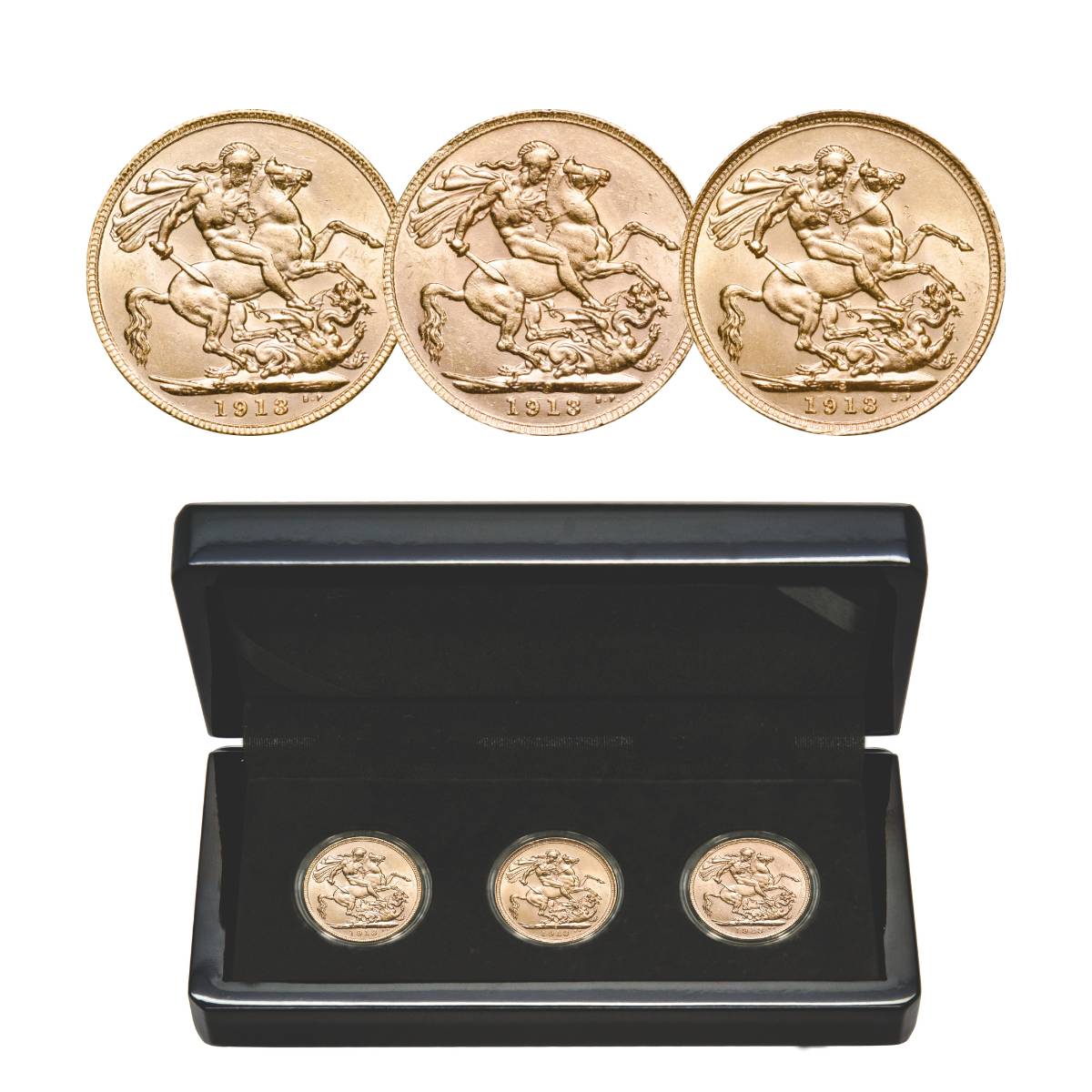 Comprises three 22-carat gold sovereigns struck in Australia in 1913.