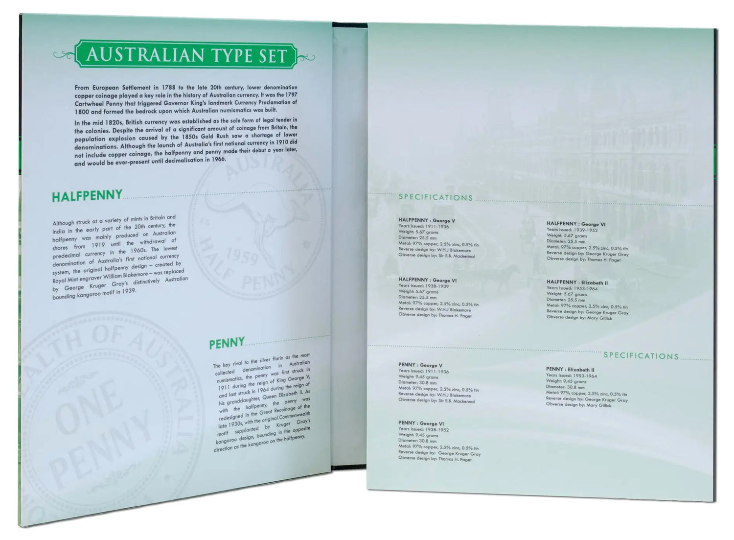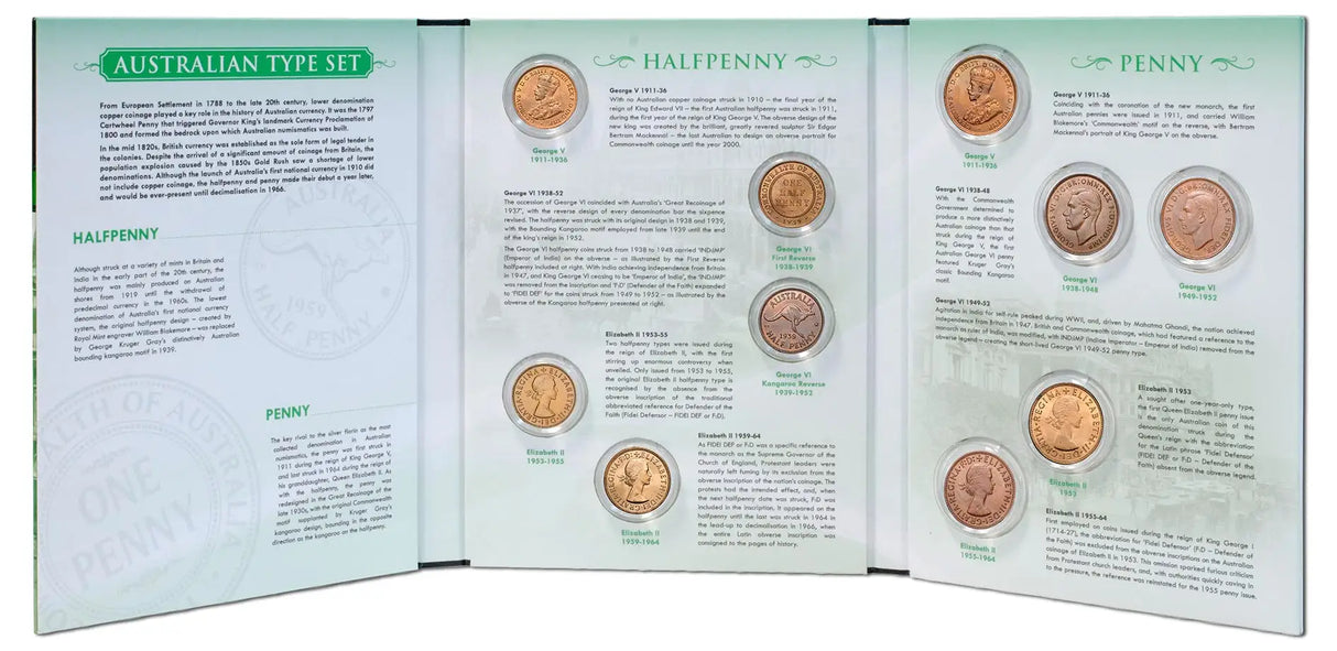 The four type sets collectively represent every obverse and reverse design employed during the predecimal era (1910-1964).