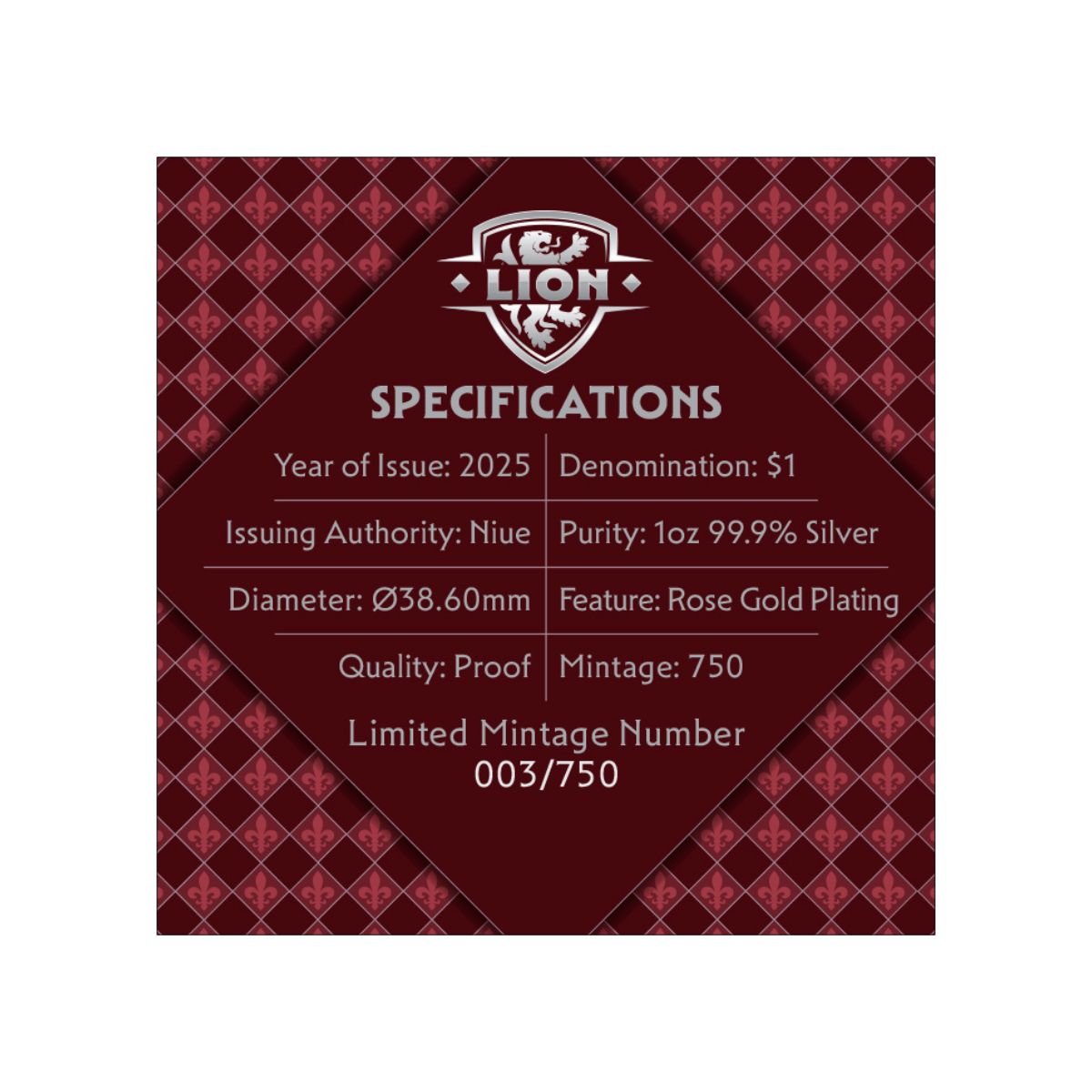 As exclusive as it is eye-catching, the Heraldic Beasts Lion 2025 $1 Rose Gold-plated 1oz Silver Proof has a limited edition of just 750 coins! Don’t ignore this opportunity – click add to cart now!