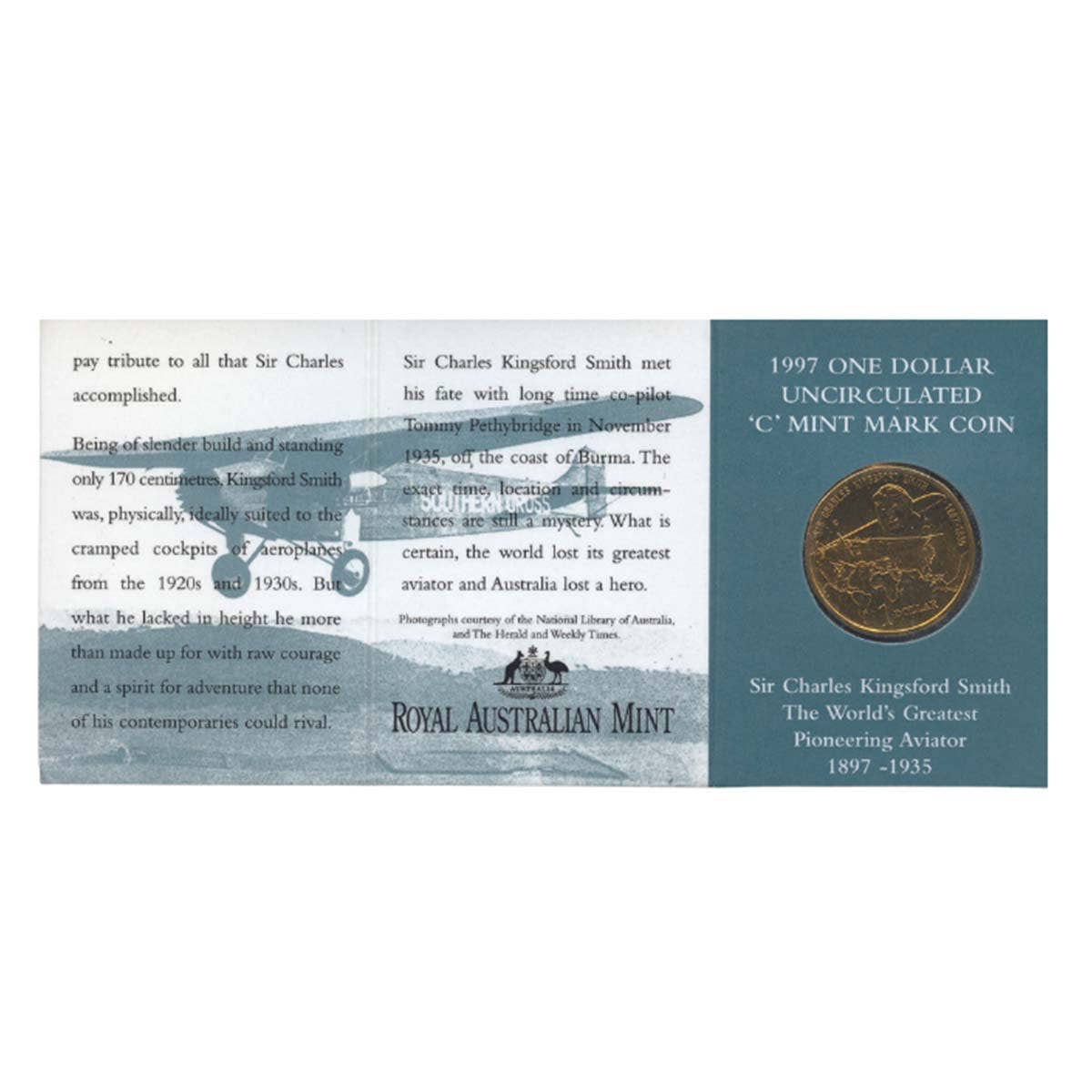 Australia Kingsford Smith Centenary 1997 $1 C Mintmark Uncirculated Coin