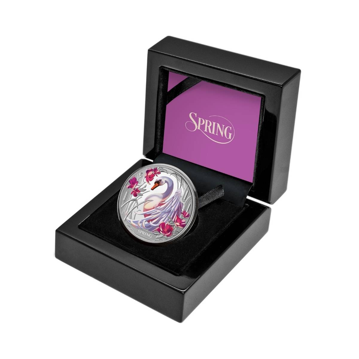 As Winter's chill gives way to the splendour of Spring, the air is filled with the scent of purple magnolia blossoms that gracefully frame an elegant swan. Swans are associated with spring as they are migratory birds that return to their breeding grounds during this season. Captured in exquisite detail on this Niue legal tender coin, the tableau is vibrantly rendered in striking Digital Colour. The elegance of the swan, coupled with the vivid hues of the magnolias, shines brilliantly on the lustrous surface of 1oz 99.9% PURE SILVER, embodying the essence of purity and rejuvenation.