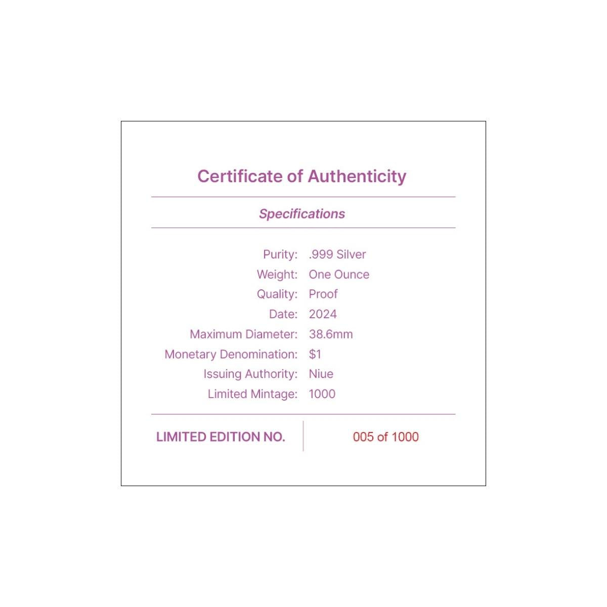 Struck to impeccable Proof quality from 1oz 99.9% PURE SILVER!