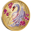 As the frost of winter melts away, the world is transformed by the jewels of nature - lush purple magnolia blossoms encircling an elegant swan. Swans are associated with spring as they are migratory birds that return to their breeding grounds during this season. This mesmerizing scene is exquisitely portrayed on the reverse of a Niue legal tender coin, brought to life in stunning Digital Colour. The serene grace of the swan, and the radiant purple of the magnolias, are dramatically highlighted against the backdrop of 1oz 99.99% PURE GOLD, creating a visual spectacle that symbolizes renewal and purity.