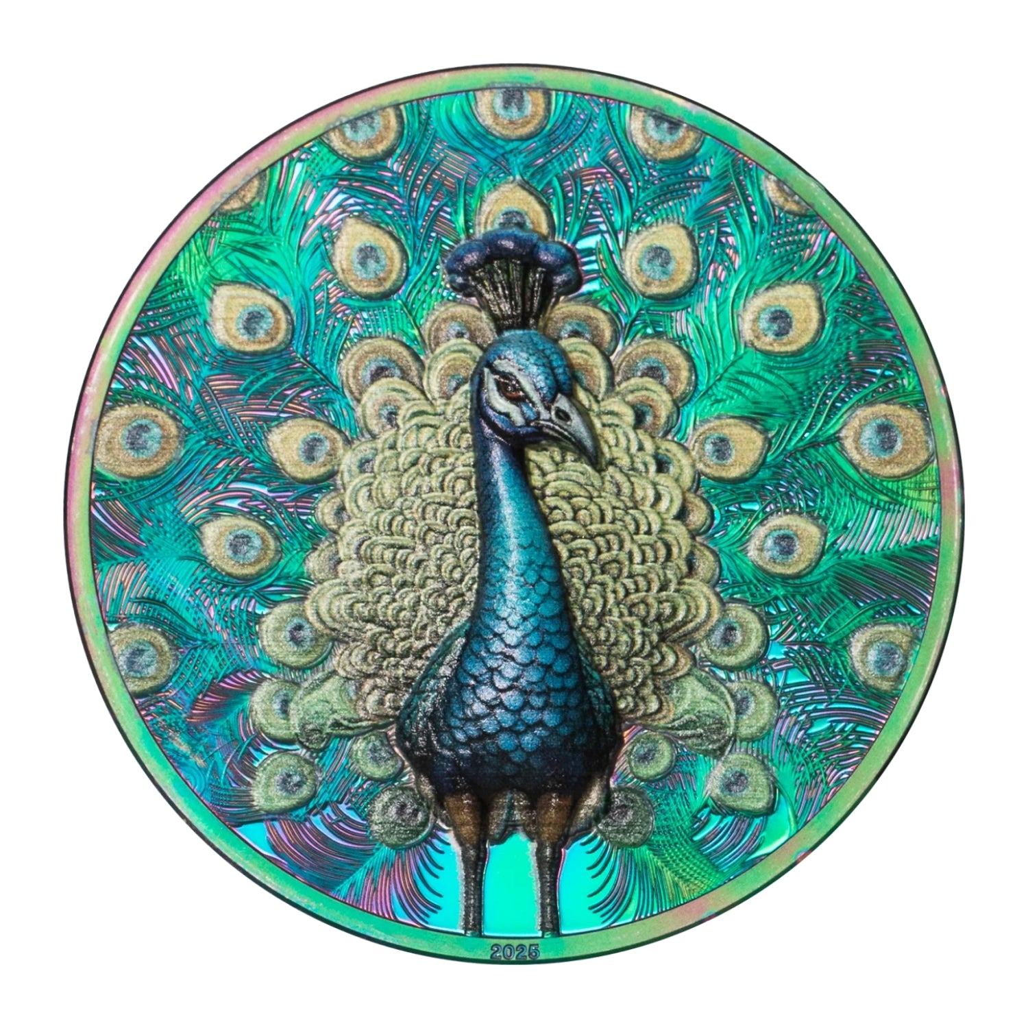 Few sights in nature compare to the splendour of a peacock displaying its radiant plumage. The 2025 Peacock 1oz Prisma Plated Silver Proof Coin captures that moment of wonder, with an intricate design showcasing the bird’s iconic eye-like feather patterns.