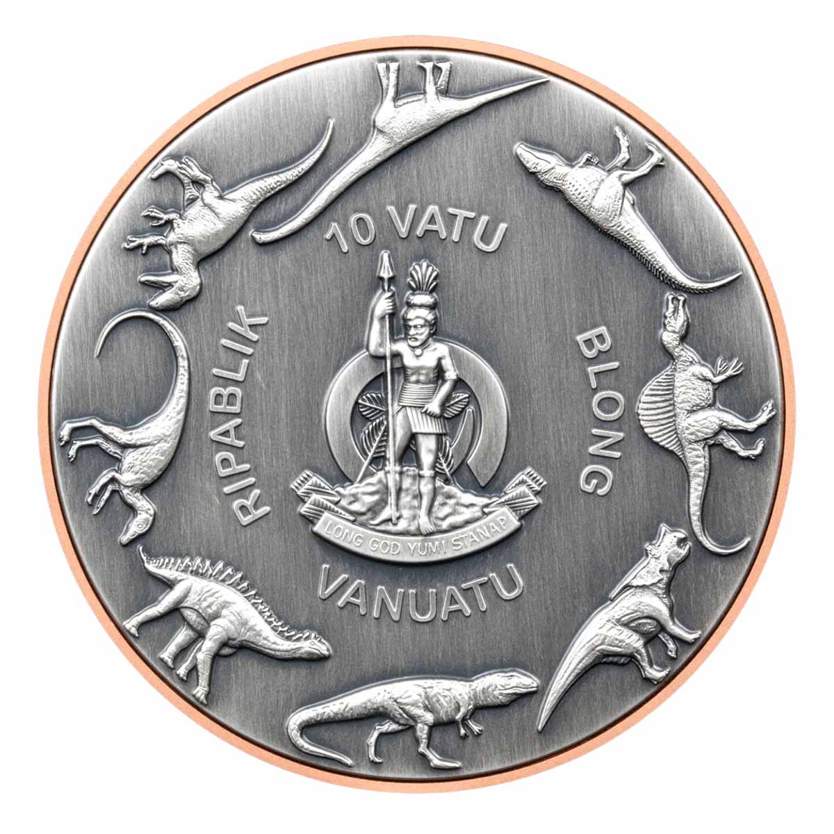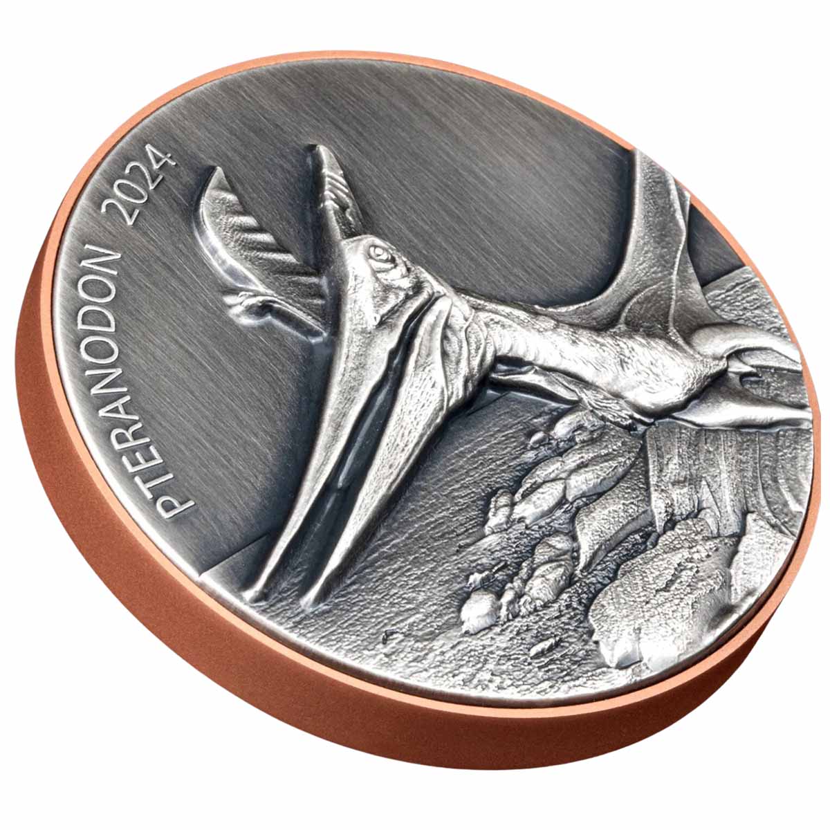 A unique tribute to the Pteranodon, this mighty coin comprises a massive 145 gram copper core, sandwiched between two 5 gram discs of pure 99.9% silver!