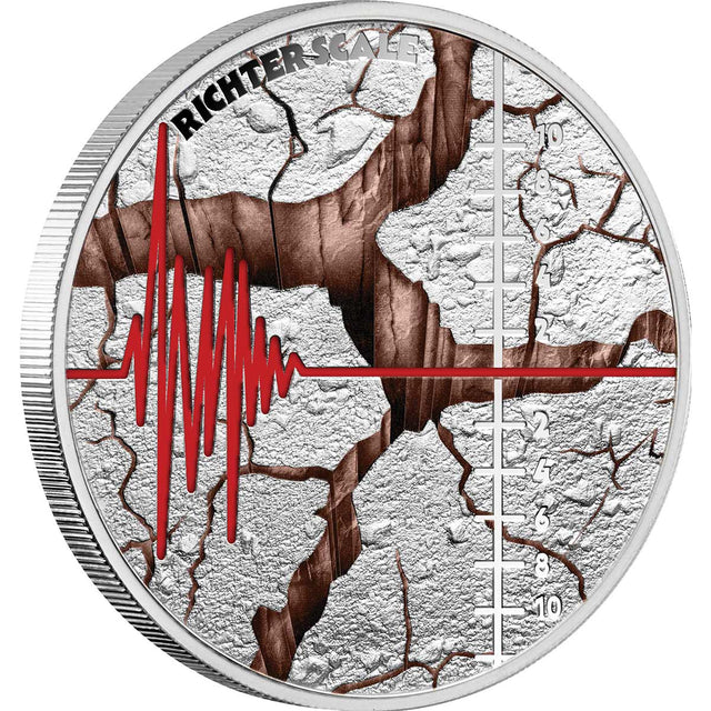 A dramatic example of the power of modern minting, the Richter Scale 2025 $1 1oz Silver Proof Coin captures the essence of an earthquake through the expert application of full-colour. United with a bright red portrayal of the Richter Scale in action, the use of full-colour creates the illusion of deep cracks in the coin, representing the deadly fissures created by earthquakes!