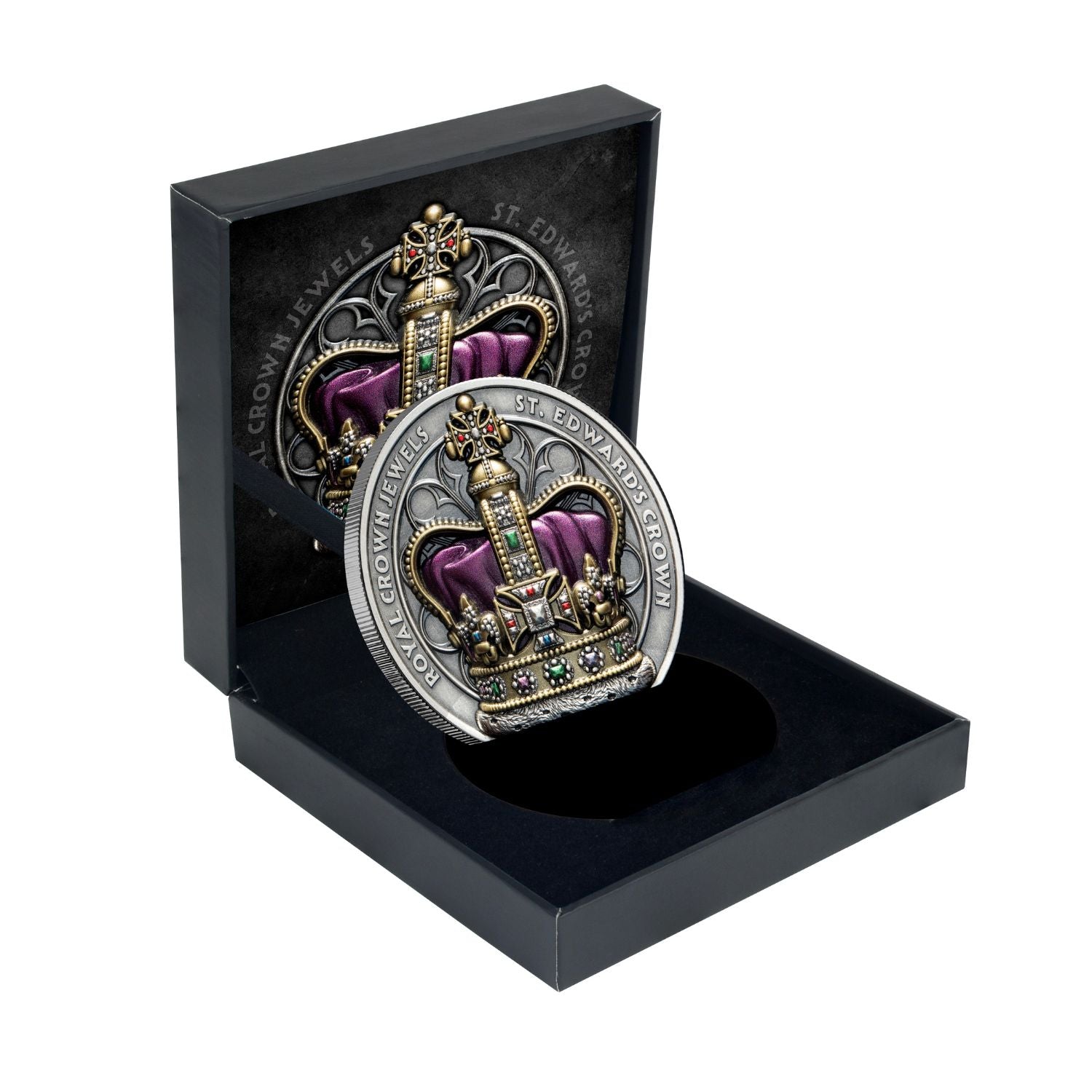 The ultimate symbol of the power of the monarchy, St Edward’s Crown has been used for the Coronation of virtually every English King and Queen since 1661. An inspired tribute to the centrepiece of the Coronation Regalia, this magnificent new coin is struck to Ultra High Relief quality from 2oz of 99.9% pure silver. Underpinned by a rich, distinctive Antique finish, and featuring full-colour elements representing the 444 precious and semi-precious stones found in the original crown, this eye-catching release has one very special feature. A triumph of innovation, each coin has been struck in a flat-based, freestanding format!