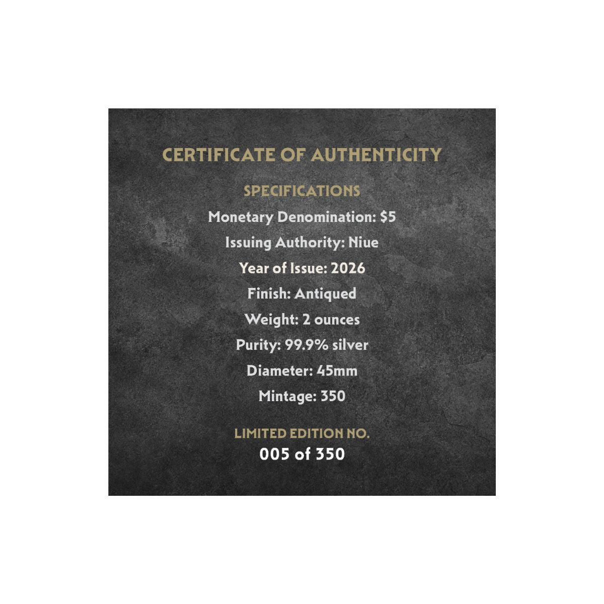 Struck to Ultra High Relief quality from 2oz of 99.9% silver!