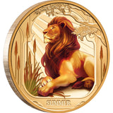 A truly magnificent coin, and an official legal tender issue, this stunning tribute to summer is struck to the apex of Proof quality from 1oz of pure, glittering 99.99% gold. Spanning a crown-sized 38.60mm in diameter, the imposing flan forms the perfect venue for the majestic portrayal of the King of the Jungle – the lion. Expertly rendered in glorious full-colour, the depiction of the noble lion relaxing beneath trees to escape the heat is emblematic of Summer.