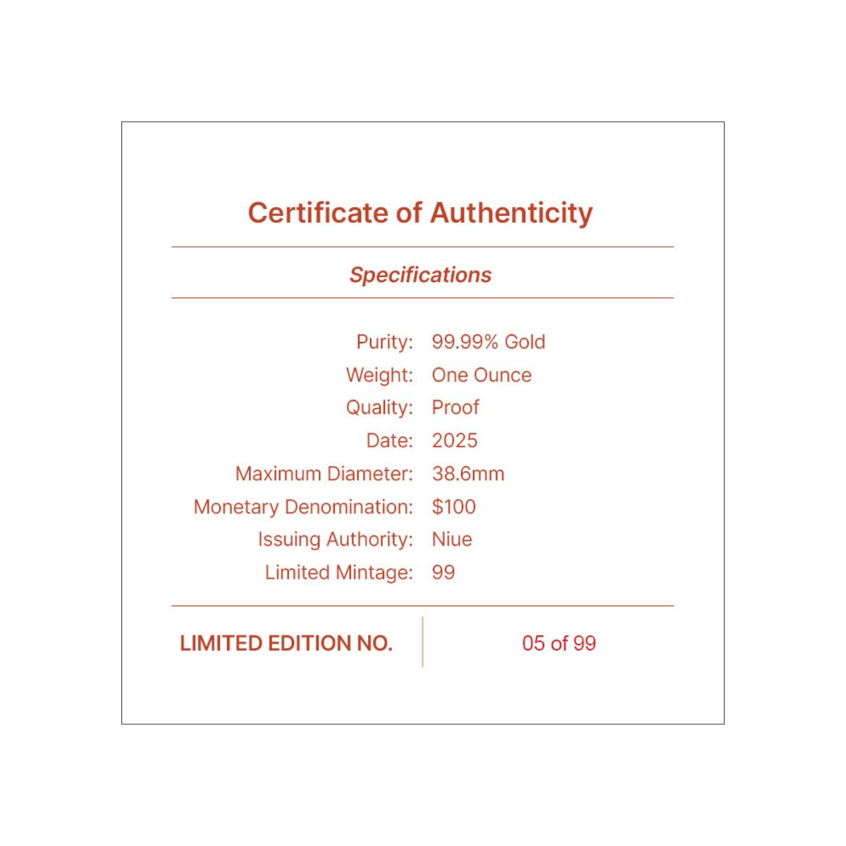Struck to the peak of Proof quality from 1oz of 99.99% pure gold!