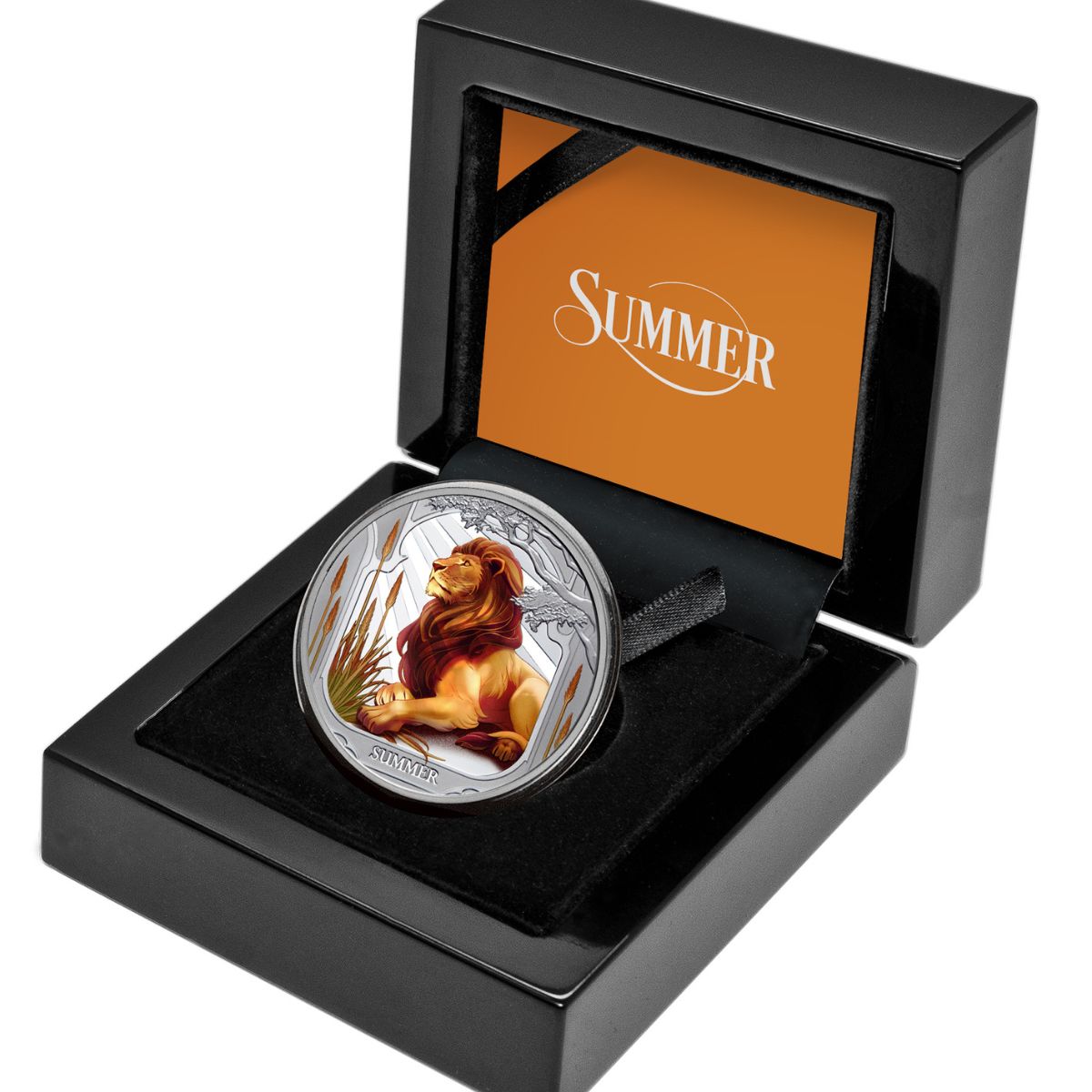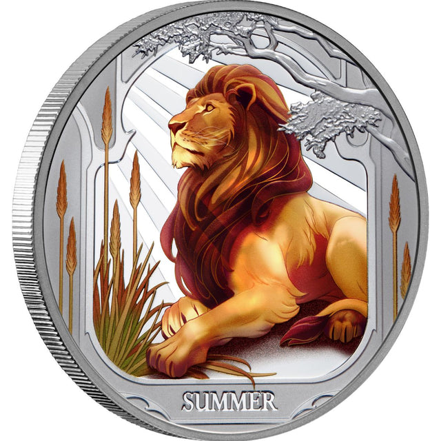 Official legal tender, this impressive new coin is struck to the pinnacle of Proof quality from 1oz of pure, lustrous 99.9% silver. A crown-sized issue, measuring 38.60mm, the expansive flan forms the perfect venue for the magnificent portrayal of the King of the Jungle โ the lion. Superbly rendered in full-colour, the depiction of the noble lion resting beneath trees to escape the heat is emblematic of Summer.