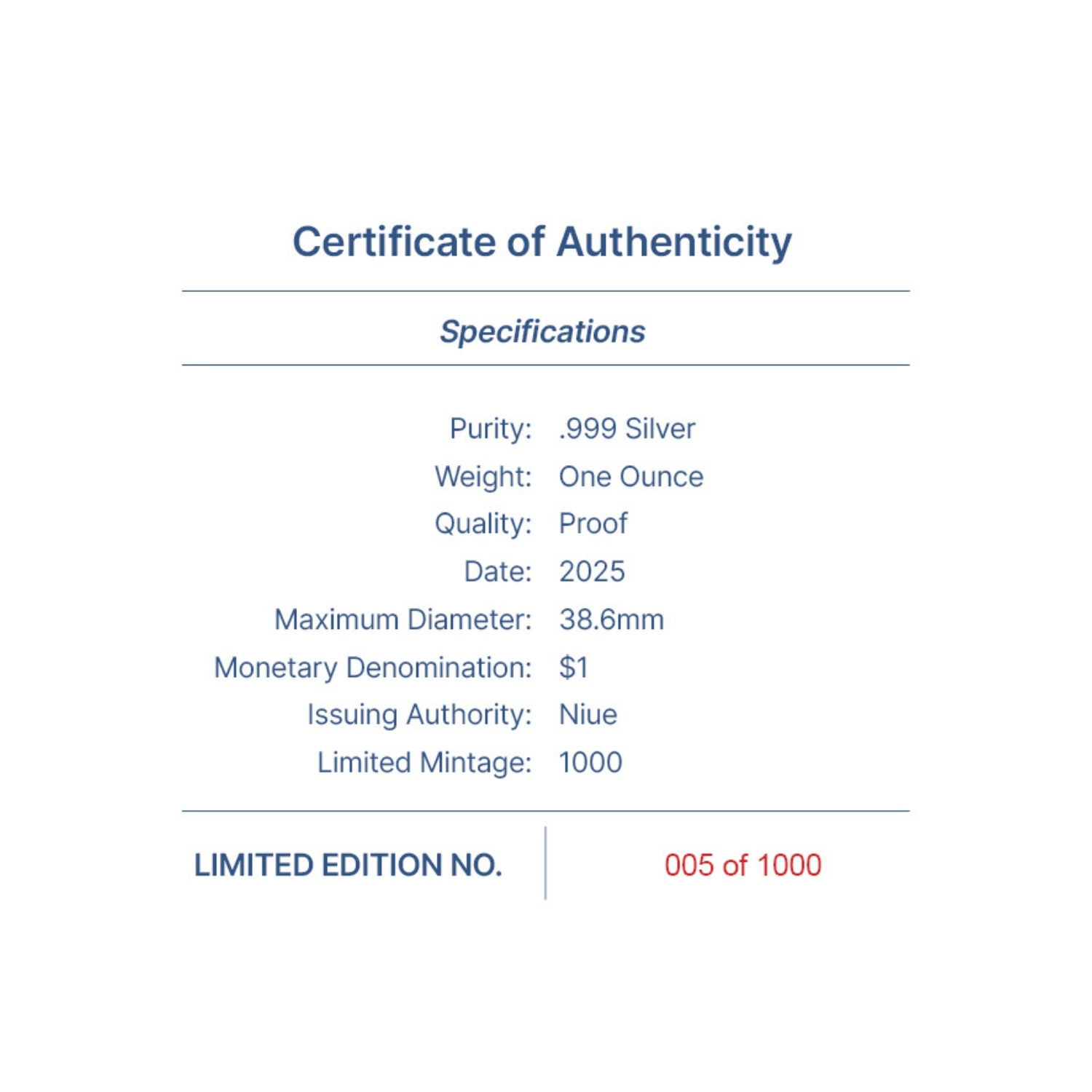 Struck to faultless Proof quality from 1oz 99.9% pure silver.