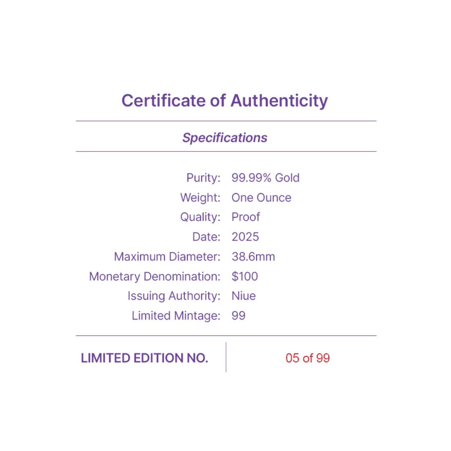 Struck to flawless Proof quality from 1oz of 99.99% pure gold!